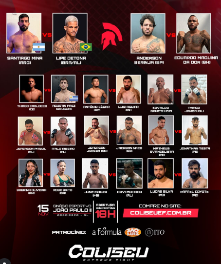 De acordo com os organizadores do Coliseu Extreme Fight serão realizadas 11 lutas no octógono. A luta principal será entre o argentino Santiago Mina versus o alagoano Lipe Detona, de 25 anos e natural de Maceió.