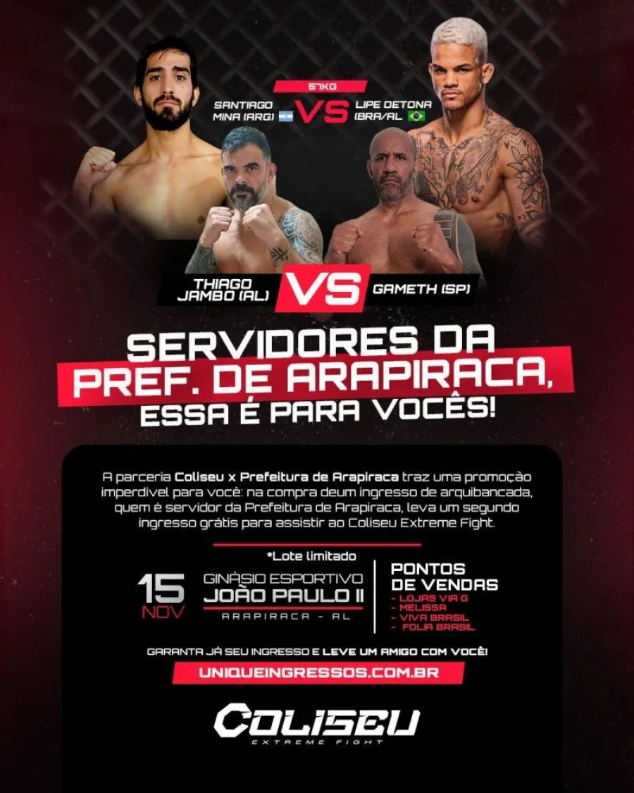 Os servidores públicos da Prefeitura de Arapiraca foram contemplados, nesta semana, com uma iniciativa especial promovida em parceria com a organização do Coliseu Extreme Fight (CEF). A ação oferece uma vantagem exclusiva para quem deseja acompanhar o evento de lutas mais aguardado da região.
