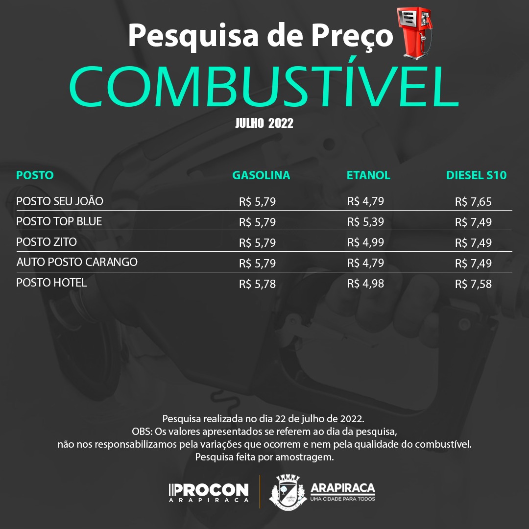 O Procon Arapiraca lançou, nesta sexta-feira (22), uma pesquisa de preço atualizada que traz os valores mínimos e máximos dos combustíveis – gasolina, etanol e diesel S-10 -, após a redução estadual da alíquota do Imposto sobre Circulação de Mercadorias e Prestação de Serviços (ICMS).