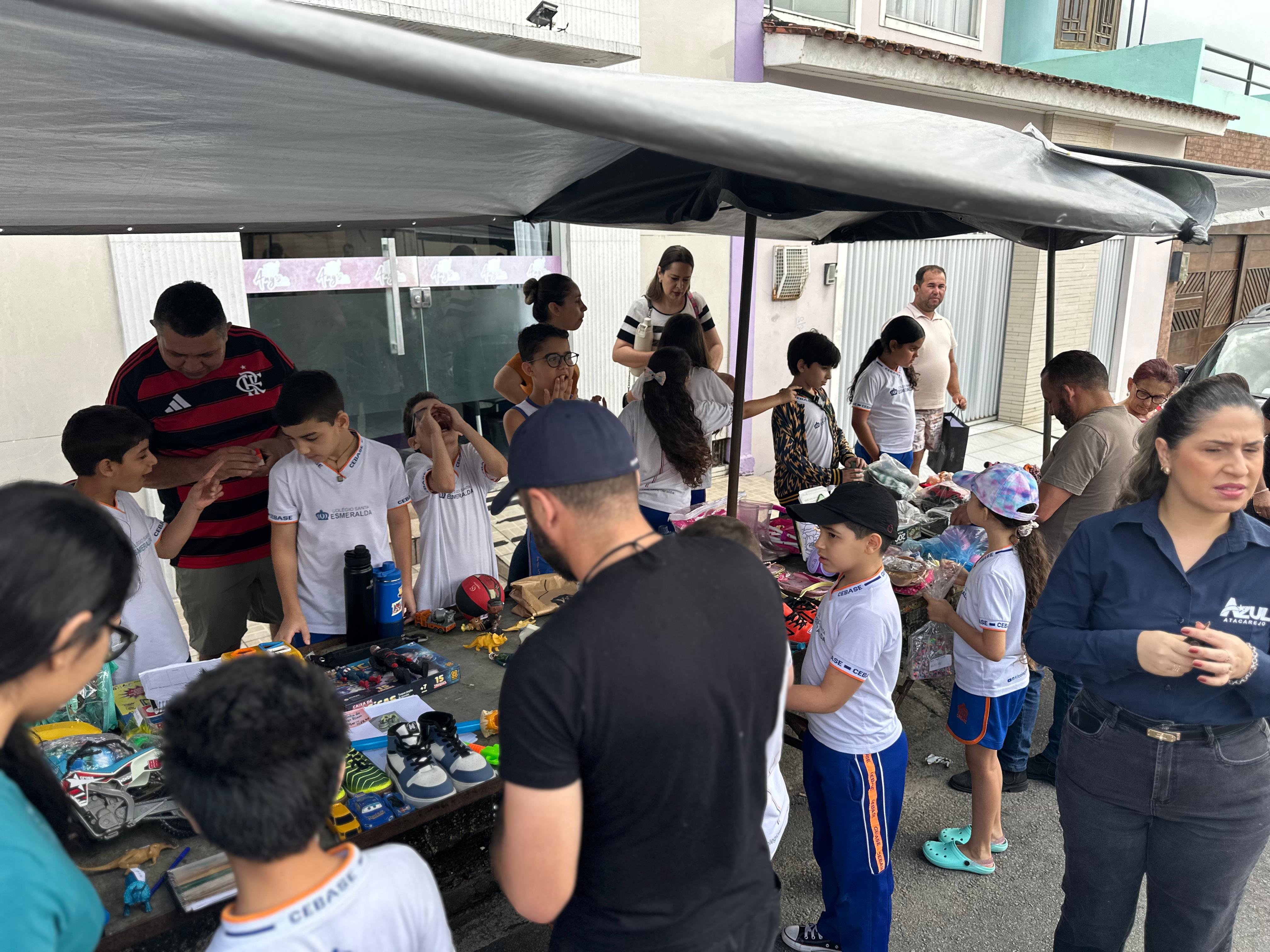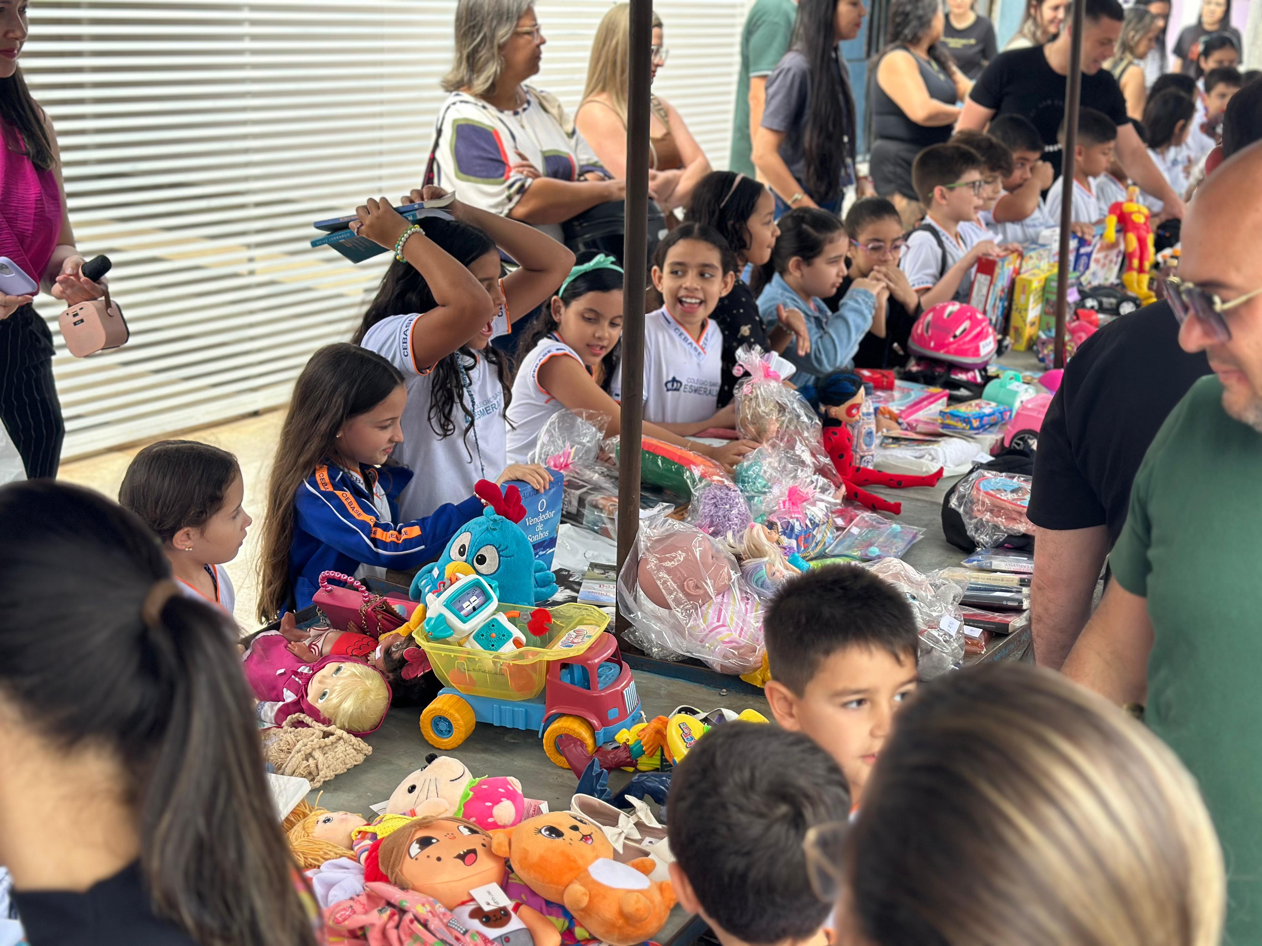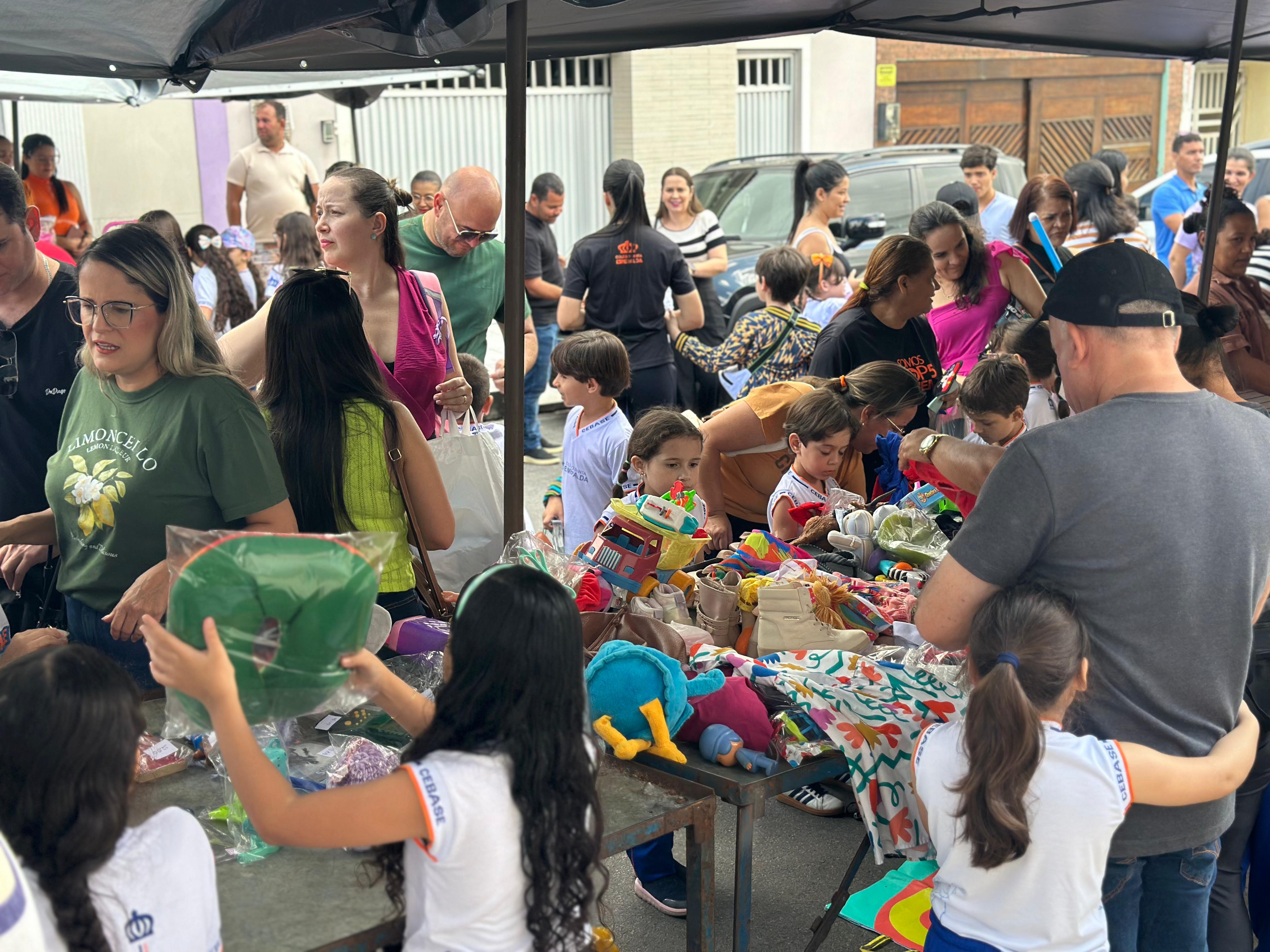 Durante o evento, os próprios alunos montam suas “lojinhas”, oferecem produtos usados em bom estado — como brinquedos, livros e roupas — e aprendem na prática a lidar com conceitos como precificação, desconto e troco.