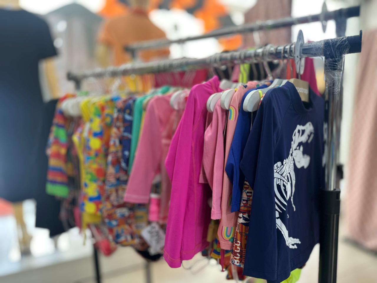 A linha praia, essencial para enfrentar o calor, está com 50% de desconto, com peças que vão dos tamanhos 1 ao 14 — biquínis, maiôs e blusas com proteção UV.