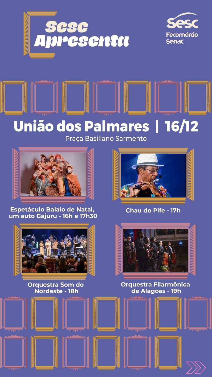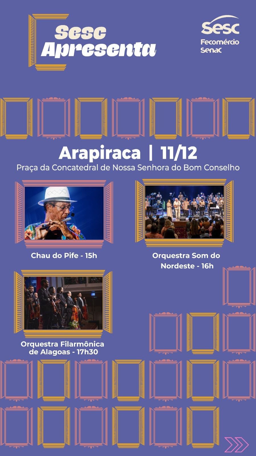 A programação de fim de ano do Sesc Alagoas ganha destaque com a edição especial Sesc Apresenta – Concertos Natalinos, que contemplará as cidades de Arapiraca, União dos Palmares e Maceió com três atrações musicais de peso no estado: Chau do Pife, Orquestra Som do Nordeste e Orquestra Filarmônica de Alagoas, além do espetáculo teatral Balaio de Natal, um auto Gajuru. Todas as atividades serão realizadas em espaços públicos, com acesso gratuito.
