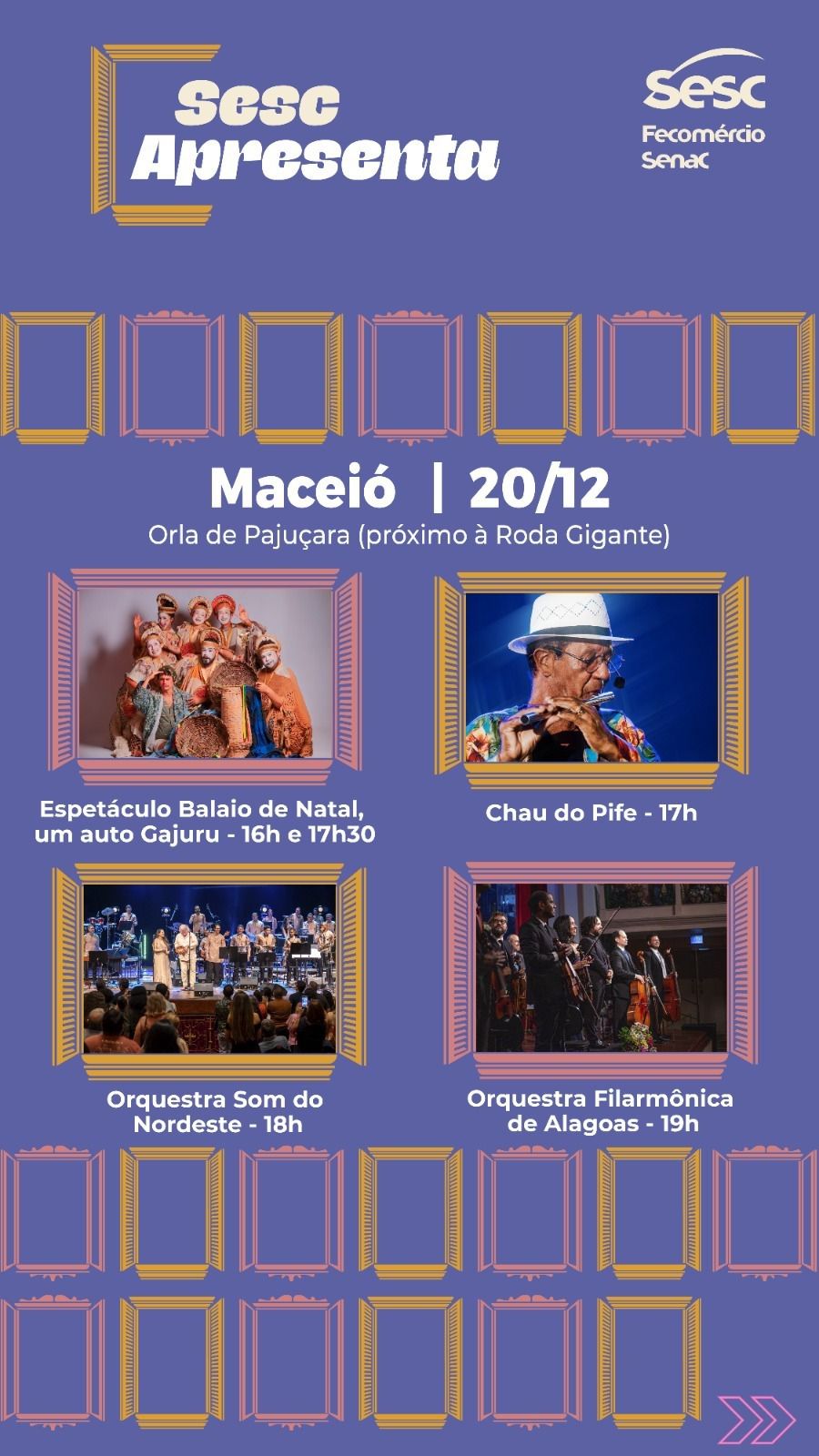 Espetáculo Balaio de Natal, um auto Gajuru - 16hChau do Pife - 17hEspetáculo Balaio de Natal, um auto Gajuru - 17h30Orquestra Som do Nordeste - 18hOrquestra Filarmônica de Alagoas - 19h