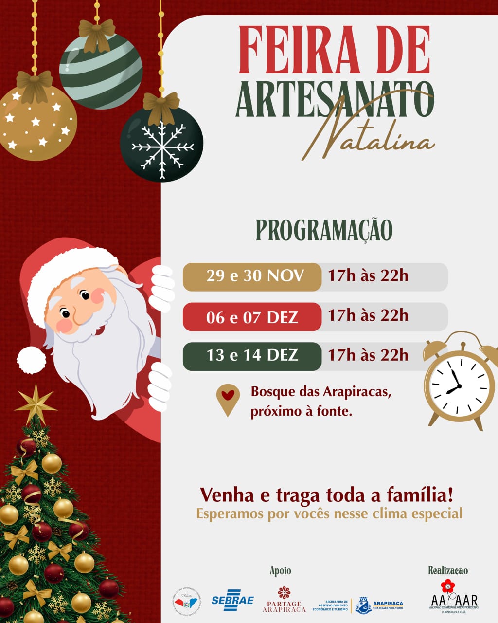 A Feira de Artesanato Natalina, realizada pela Associação dos Artesãos e Artesãs Profissionais de Arapiraca e Região (AAAPAR), entra no último fim de semana de programação no Bosque das Arapiracas, próximo à fonte.