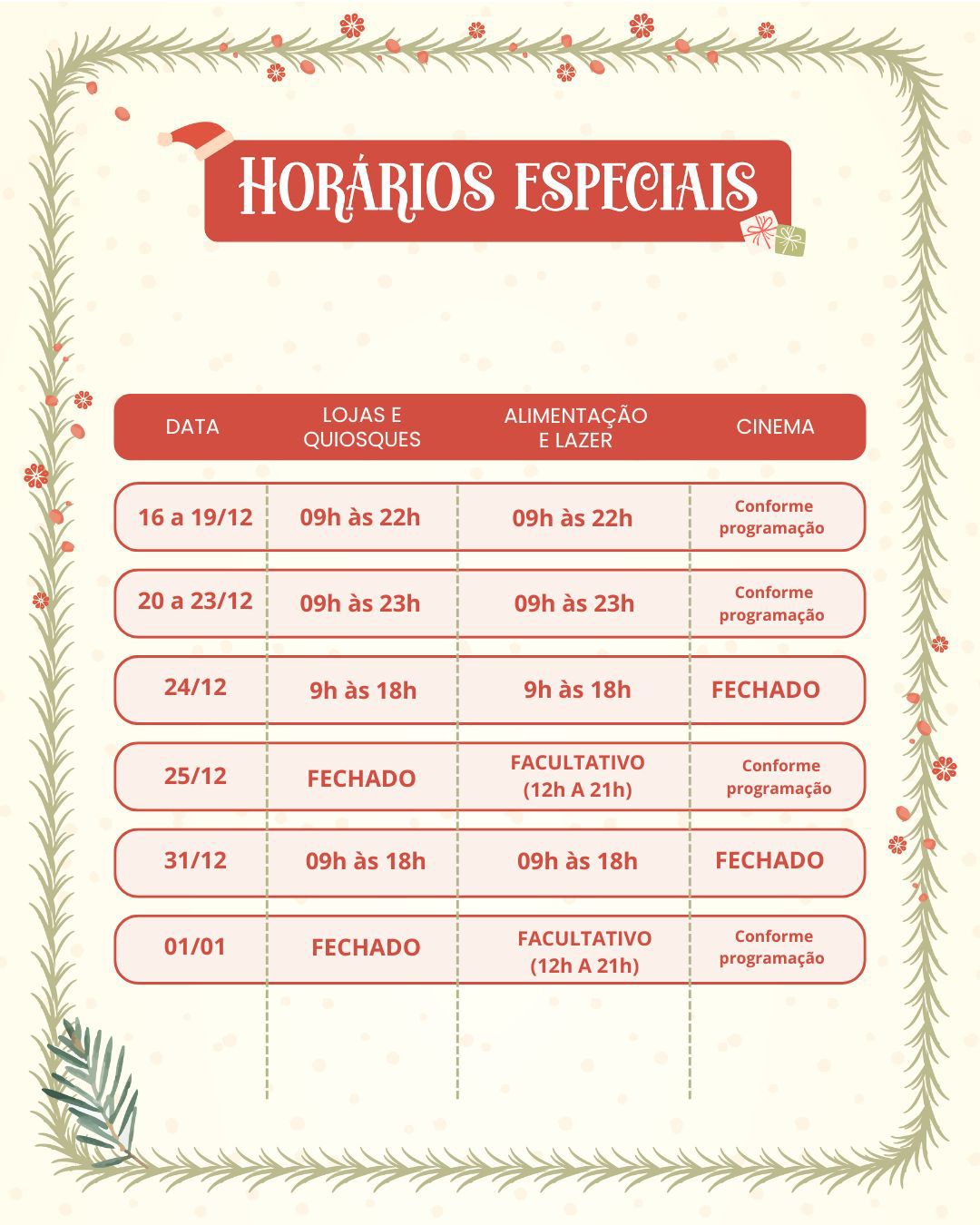 No dia 24 de dezembro, véspera de Natal, o funcionamento será das 9h às 18h, oferecendo uma última oportunidade para quem deixou os presentes para a reta final. No próprio dia 25 de dezembro, as lojas estarão fechadas, mas a praça de alimentação funcionará de forma facultativa, das 12h às 21h e o cinema conforme programação própria, mantendo o shopping como ponto de encontro para famílias que desejam celebrar a data fora de cas a.
