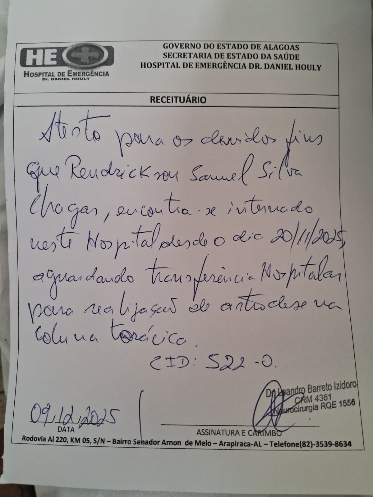 O jovem Rendrickson Samuel Silva Chagas, de 19 anos, vive dias de angústia internado no Hospital de Emergência do Agreste (HEA), em Arapiraca. Natural de Santana do Ipanema, ele aguarda, sem previsão, uma cirurgia considerada essencial para evitar o risco de paraplegia após um grave acidente de trânsito ocorrido no dia 20 de novembro de 2025.