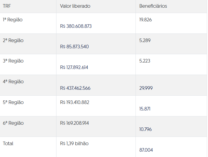 O dinheiro deve ser depositado até o início de março, conforme o cronograma de cada Tribunal Regional Federal (TRF).