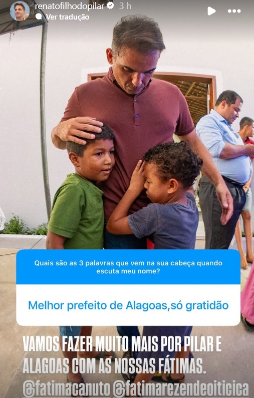 Em resposta a um seguidor que elogia seu trabalho, o ex-prefeito disse: “Vamos fazer muito mais por Alagoas e por Pilar com nossas Fátimas”.