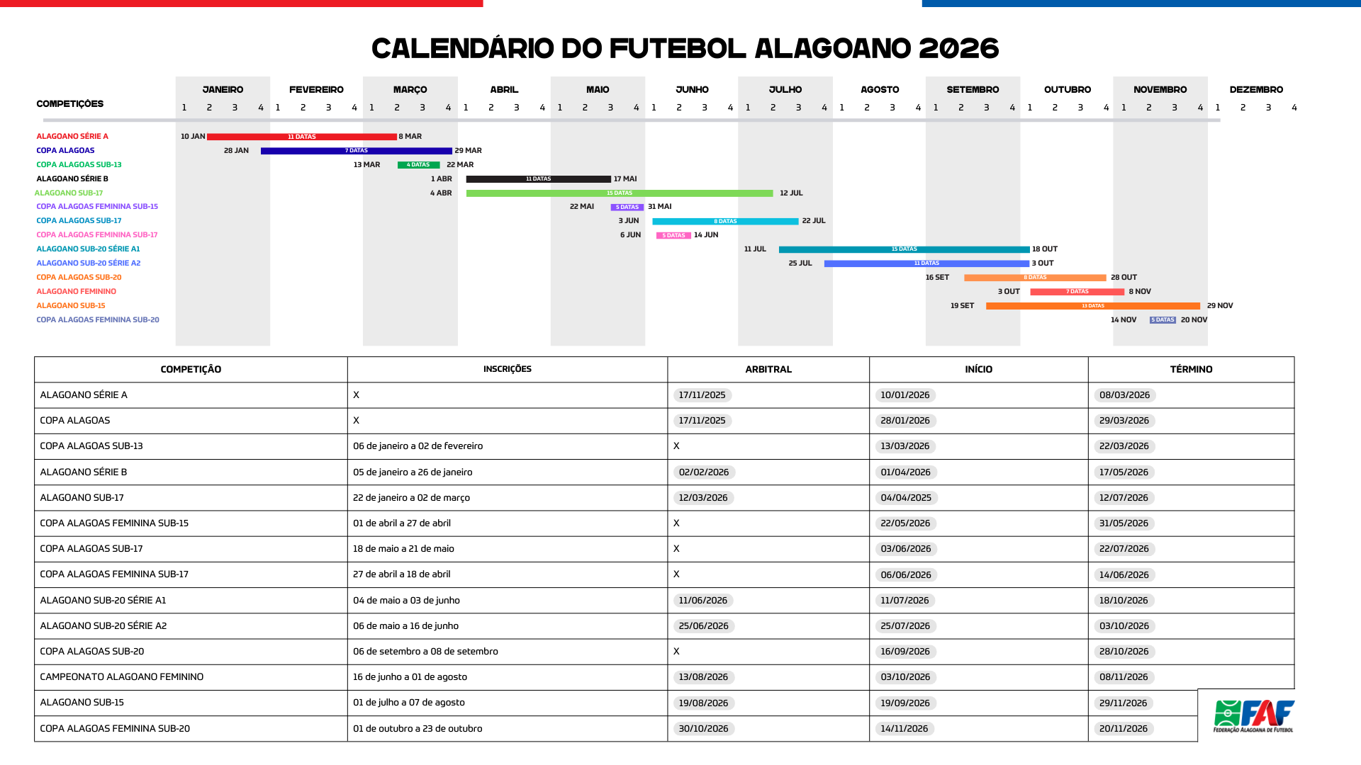 A Federação Alagoana de Futebol (FAF) publicou nesta segunda-feira (8) o calendário oficial das competições para 2026. O Campeonato Alagoano será o primeiro torneio do ano, começando em 10 de janeiro e com final marcada para 7 de março.