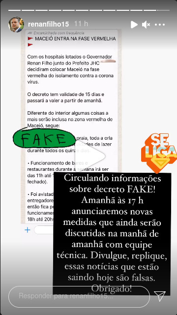 O governador Renan Filho utilizou as redes sociais para desmentir as informações. “Está circulando informações sobre decreto fake. Amanhã (16), às 17h, anunciaremos novas medidas que ainda serão discutidas na manhã de amanhã com a equipe técnica. Divulgue, replique, essas notícias que estão saindo hoje são falsas", afirmou o governador.
