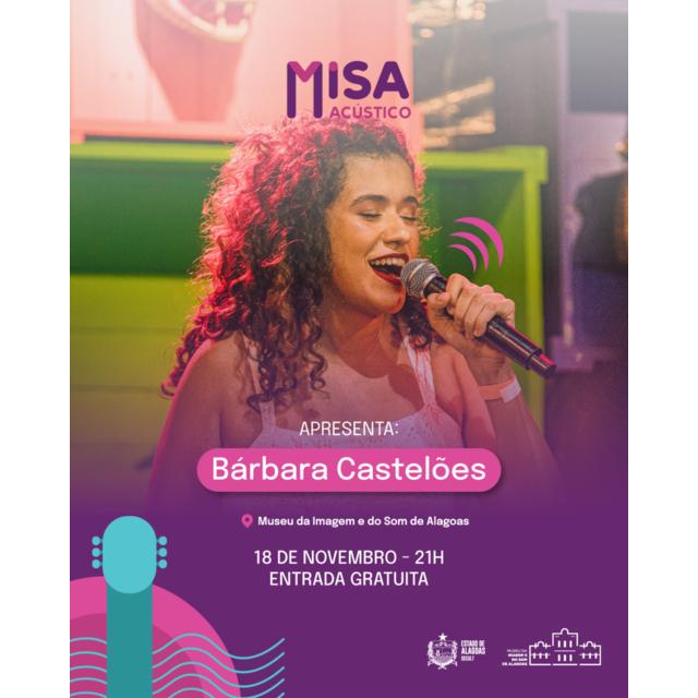 O Misa Acústico recebe nesta sexta-feira (18), a partir das 21h, o show da cantora Bárbara Castelões. A alagoana leva ao palco do auditório do Museu da Imagem e do Som de Alagoas, no bairro do Jaraguá, em Maceió, uma apresentação exclusiva para o público, mostrando toda sua bagagem e suas influências musicais. A entrada é gratuita.