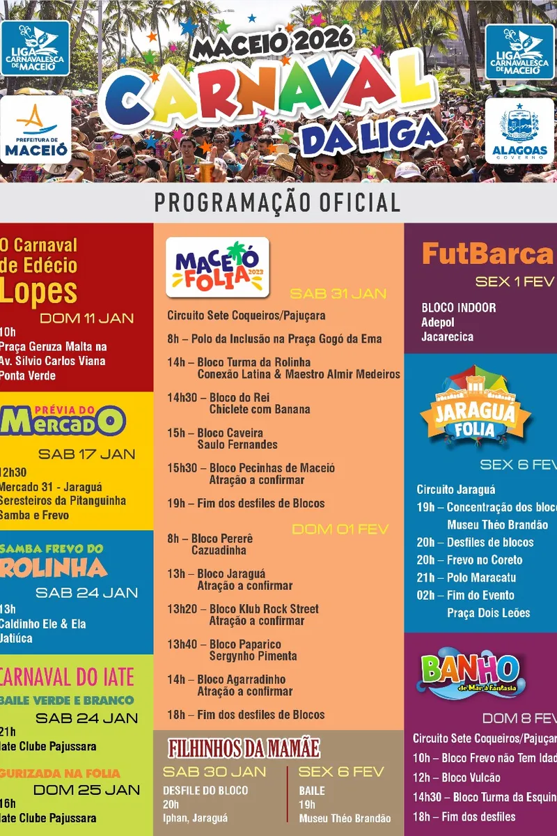 A partir desta data, todos os fins de semana até o Carnaval oficial, que começa no dia 14 de fevereiro, contarão com eventos promovidos pela Liga, em diferentes formatos — abertos, fechados e nas ruas de Maceió.