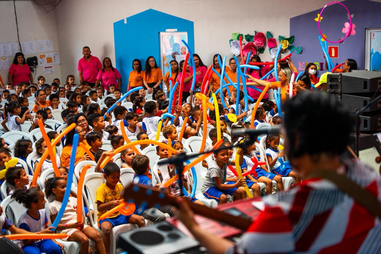 Os gigantinhos também participaram de oficinas criativas, como pintura facial, escultura de balões e contação de histórias, que foram oferecidas pelo Grupo Editorial Triz. O momento também contou com as apresentações musicais do grupo Educanto, da Semed, que animou o público com canções e performances lúdicas.