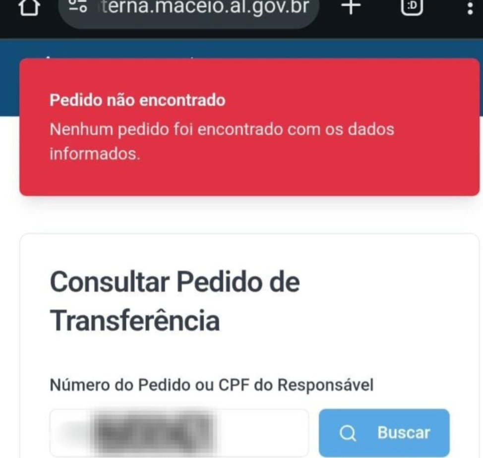 Pais e responsáveis por estudantes da rede municipal de Maceió relataram dificuldades para acessar o resultado das transferências internas, previsto para ser divulgado no dia 1º de dezembro. Segundo relatos recebidos pelo portal 7Segundos, ao tentar consultar as informações, muitos se depararam com a mensagem: "Pedido não encontrado. Nenhum pedido foi encontrado com os dados informados".