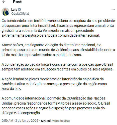O presidente Luiz Inácio Lula da Silva (PT) repudiou neste sábado (3) os ataques realizados pelos Estados Unidos contra a Venezuela e a captura do presidente Nicolás Maduro e da primeira-dama, Cilia Flores. Em publicação nas redes sociais, Lula afirmou que a ação “ultrapassa uma linha inaceitável” e representa uma grave violação do direito internacional.