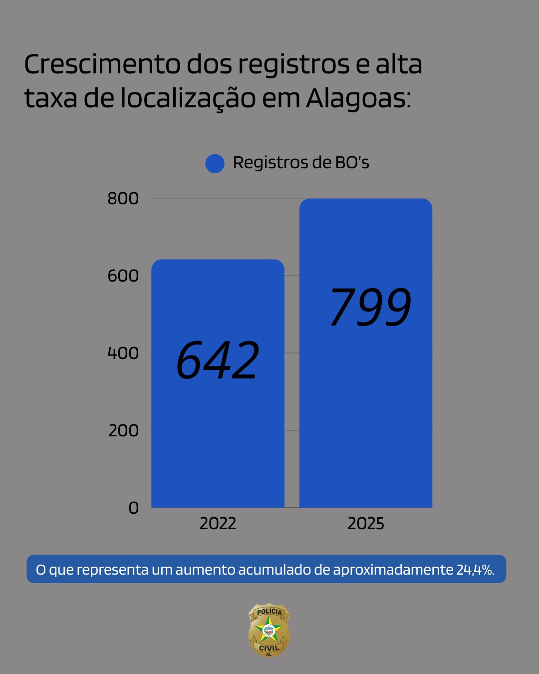 Levantamento estatístico referente ao período de 2022 a 2025 aponta crescimento nos registros de boletins de ocorrência (BO's), passando de 642 em 2022 para 799 em 2025, o que representa um aumento acumulado de aproximadamente 24,4%.