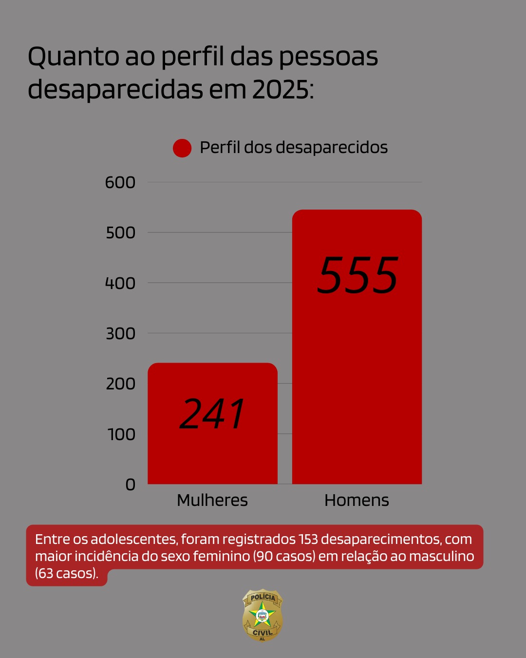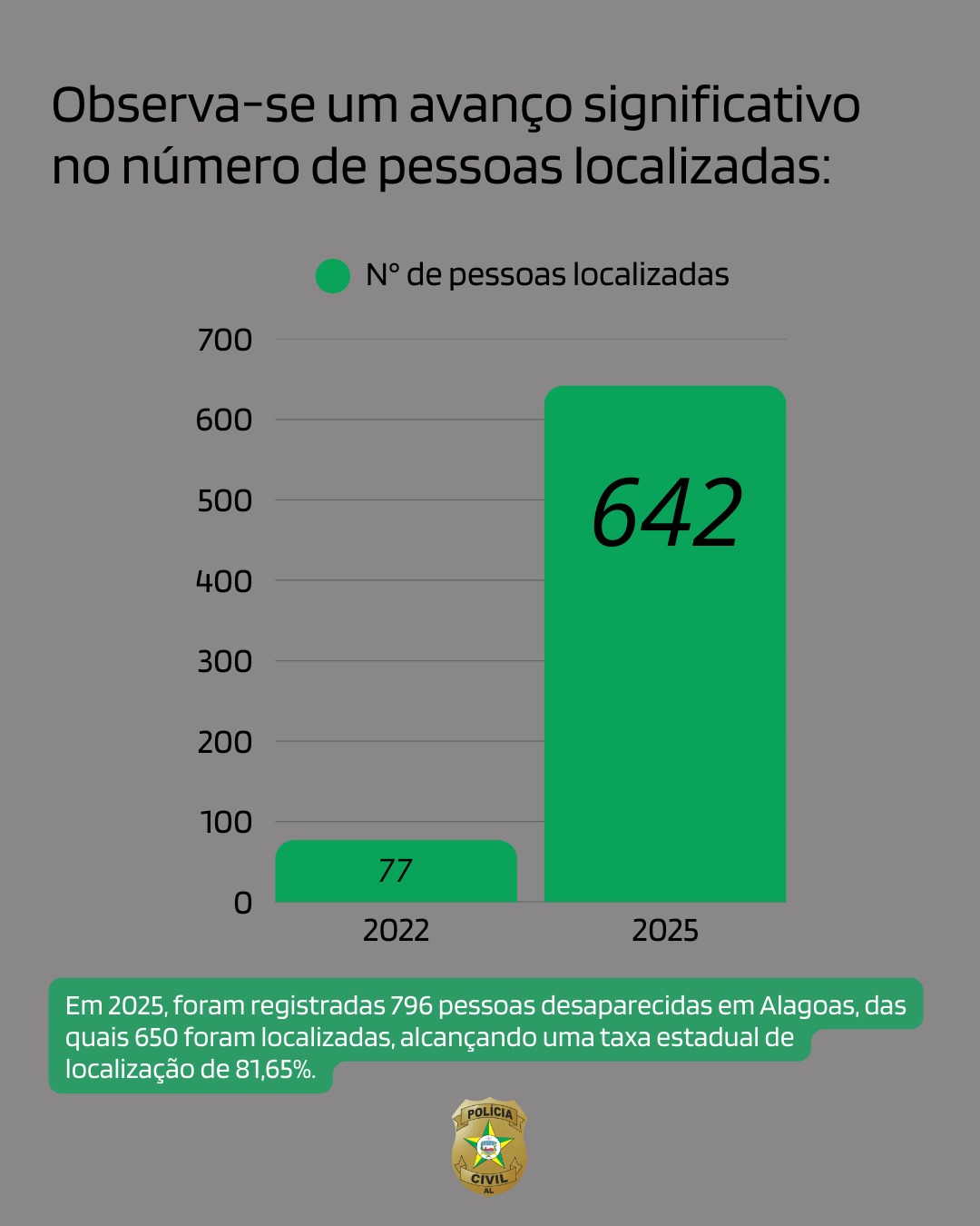 Em 2025, foram registradas 796 pessoas desaparecidas em Alagoas, das quais 650 foram localizadas, alcançando uma taxa estadual de localização de 81,65%, considerada elevada e indicativa da efetividade do trabalho contínuo desenvolvido pelas equipes especializadas.