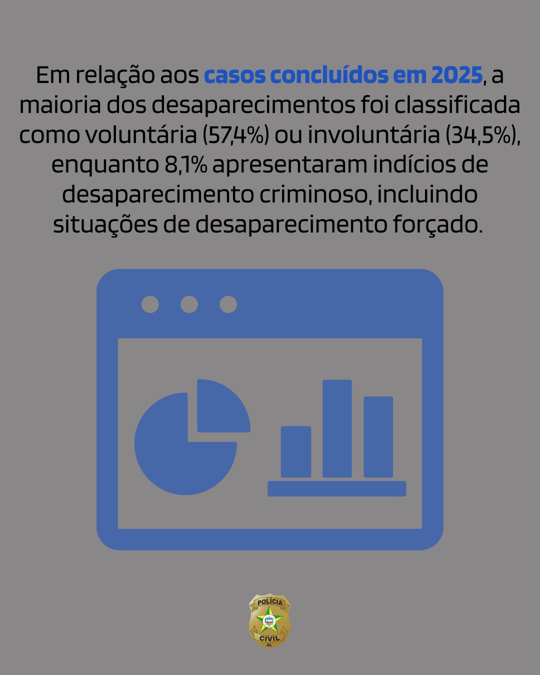 Em relação aos casos concluídos em 2025, a maioria dos desaparecimentos foi classificada como voluntária (57,4%) ou involuntária (34,5%), enquanto 8,1% apresentaram indícios de desaparecimento criminoso, incluindo situações de desaparecimento forçado.