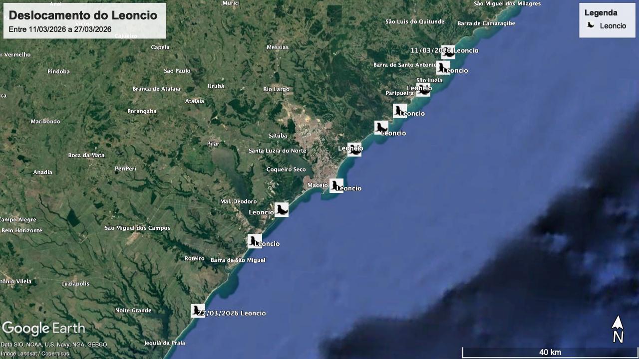 Leôncio vem sendo acompanhado desde o início do mês e já percorreu cerca de 10 pontos do litoral alagoano. O primeiro registro foi no dia 11 de março, na praia de Carro Quebrado, em Barra de Santo Antônio, passando também por Maceió antes de seguir para o Litoral Sul.