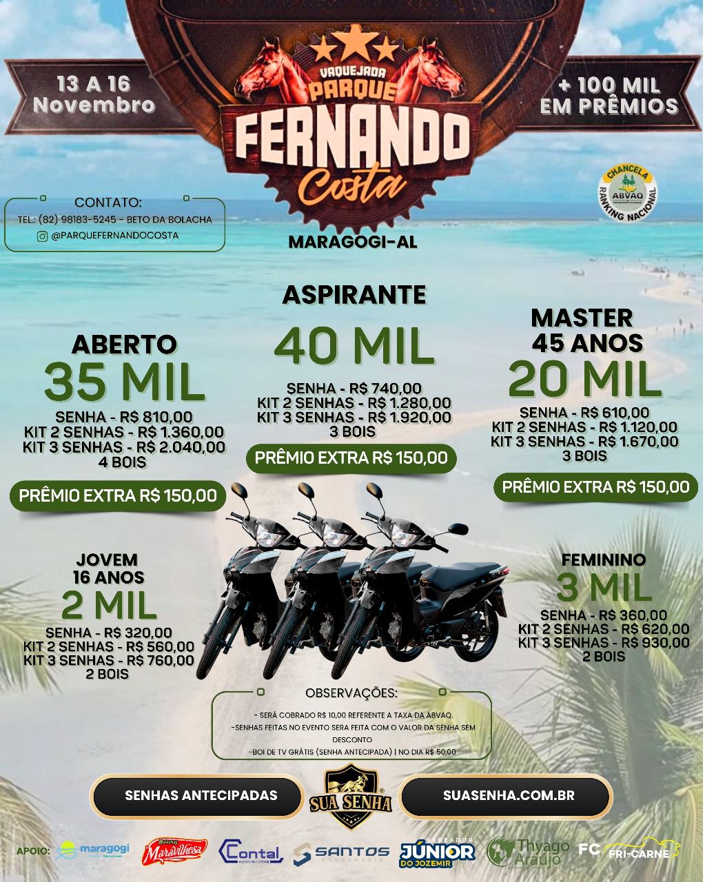 A 5ª edição da vaquejada no Parque Fernando Costa, no município de Maragogi, promete recorde de público e consolida-se como o maior encontro de vaqueiros e vaqueiras do Norte de Alagoas e da região da Costa dos Corais. O evento no histórico povoado São Bento ocorre no período de 13 a 16 de novembro de 2025 e vai atrair participantes de várias partes do Brasil.