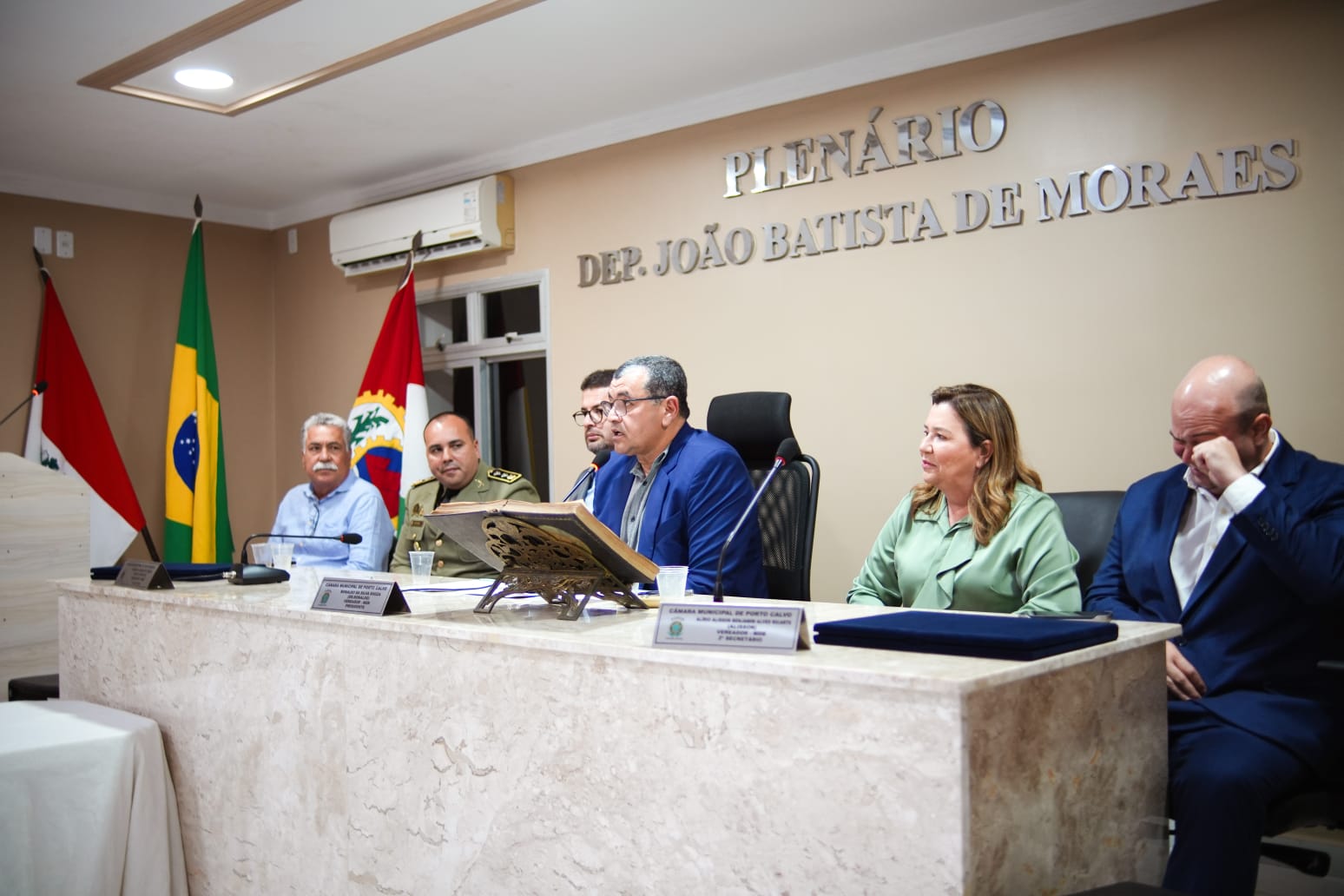 A Câmara de Porto Calvo entregou dois títulos de cidadão honorário na sessão solene realizada na noite desta terça-feira (9) na Casa Laurindo Francisco de Oliveira. Os homenageados com a honraria foram o comandante do 6º Batalhão da Polícia Militar (6º BPM), major Aleandro Ferreira Caitano, e o diretor da Usina Santa Maria, Leonardo Oticica.