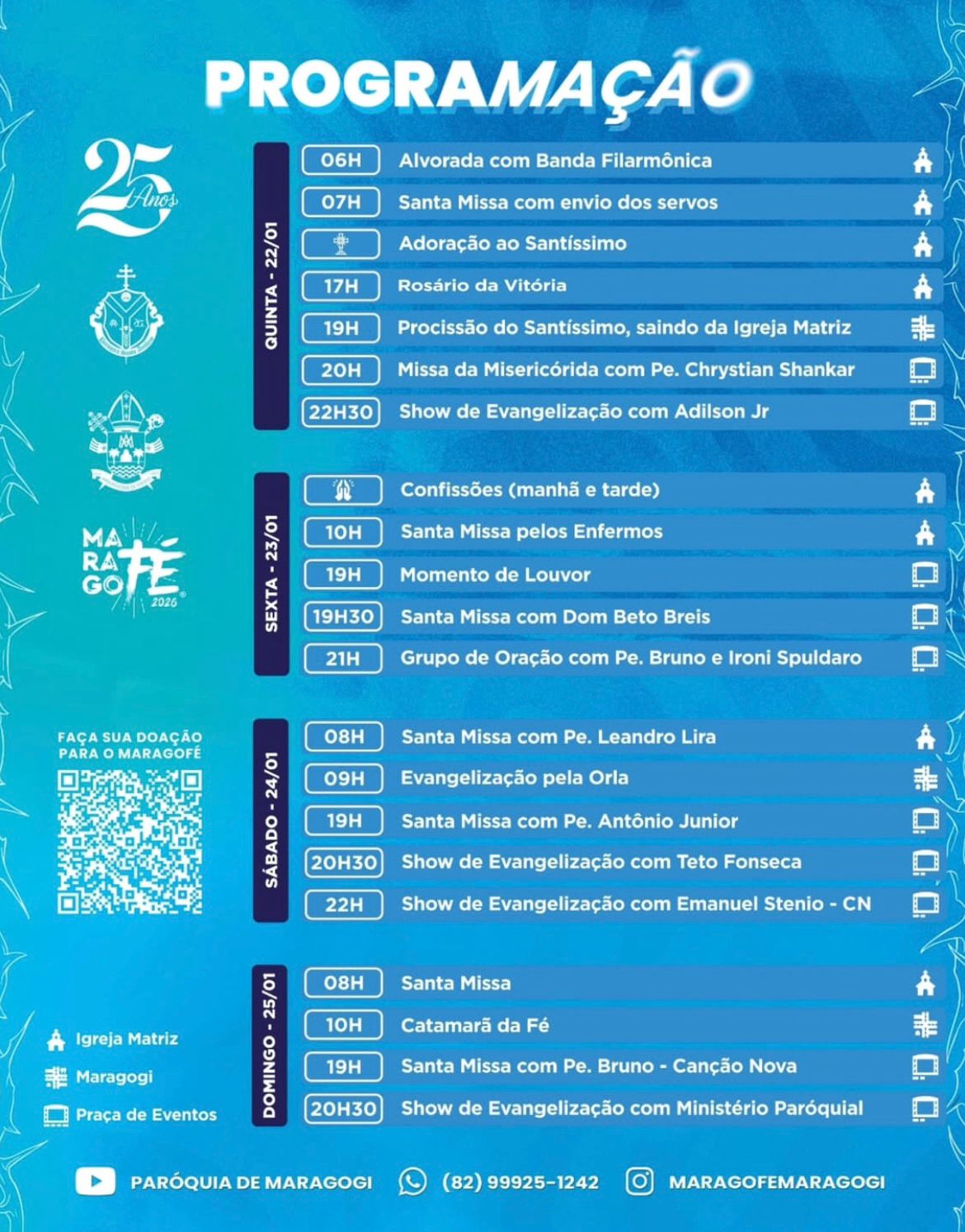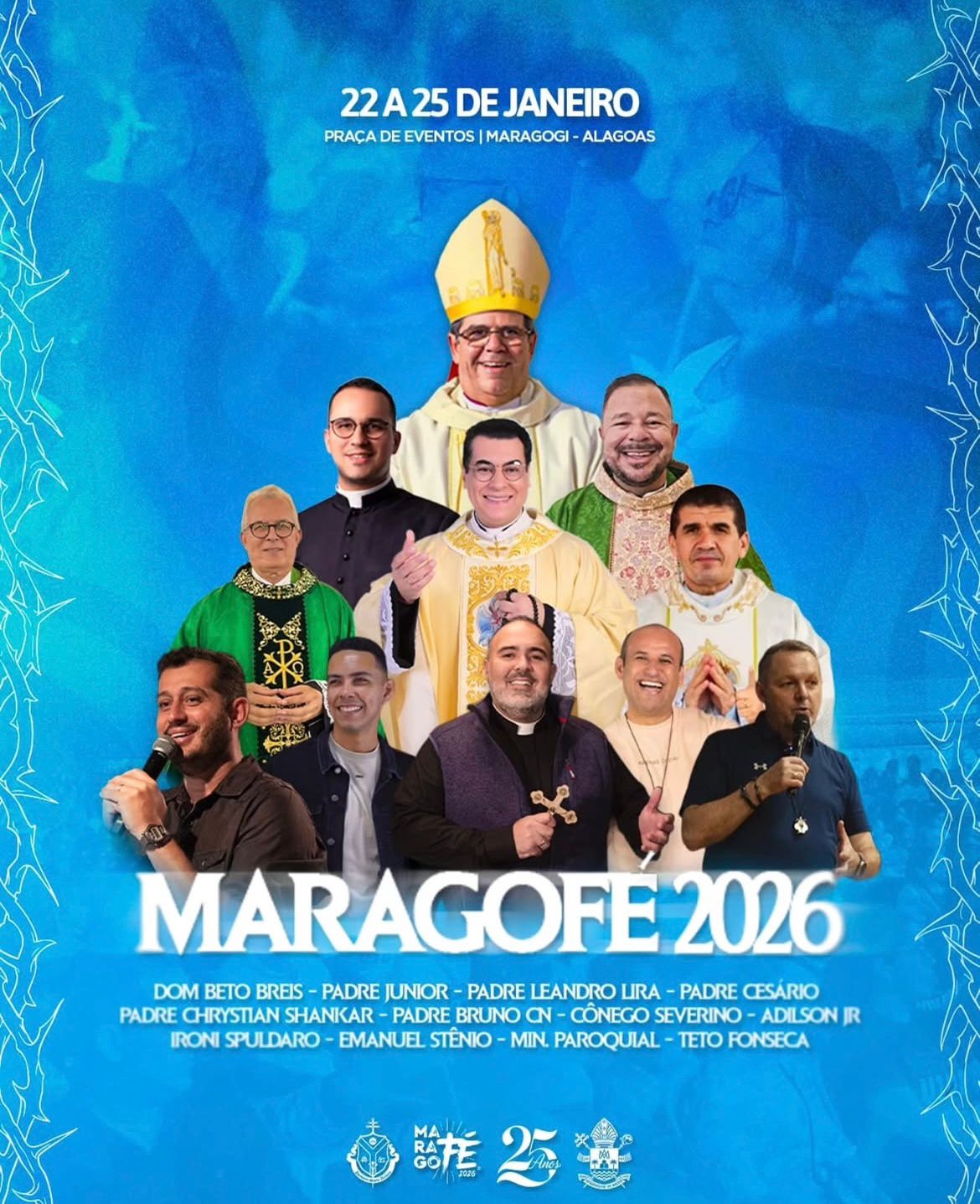 Um dos maiores eventos religiosos do Litoral Norte de Alagoas inicia nesta quinta-feira (22) em Maragogi e promete atrair um grande público. O Maragofé 2026 completa 25 anos e vai promover muita evangelização no período de 22 a 25 de janeiro.
