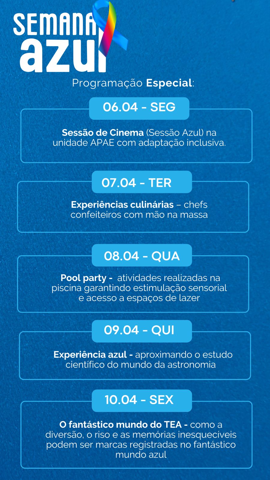 Ao longo da semana, serão realizadas atividades adaptadas e inclusivas na unidade da APAE, como sessão de cinema com ambientação especial (Sessão Azul), experiências culinárias, atividades na piscina com estímulos sensoriais, vivências educativas com temática científica e ações voltadas ao universo do autismo, promovendo momentos de aprendizado, interação e desenvolvimento para os usuários.