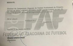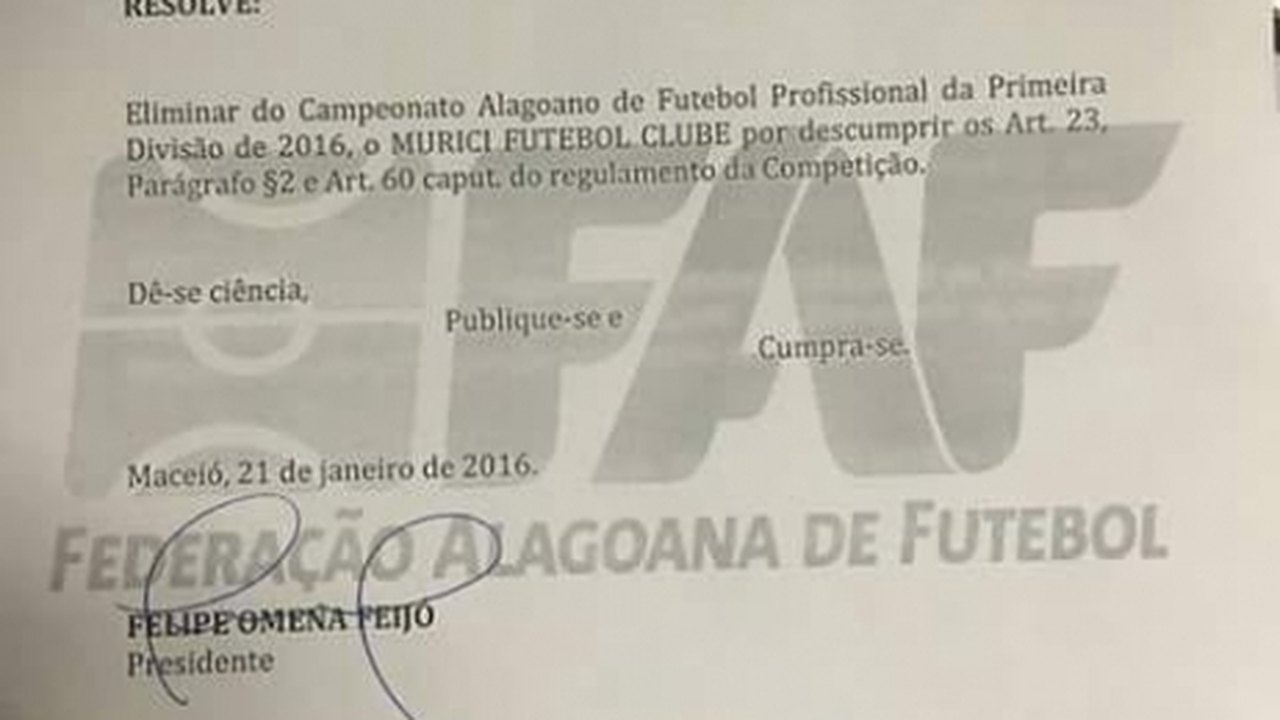 O presidente da Federação Alagoana de Futebol (FAF) baixou um ato na noite desta quinta-feira (21) excluindo o Murici do Campeonato Alagoano 2016. A equipe foi eliminada por não cumprir os Artigos 23, parágrafo 2 e o artigo 60 do regulamento do Campeonato, que diz respeito a inscrição de atletas no Boletim Informativo Diário (BID) da CBF e sobre as certidões negativas.