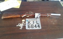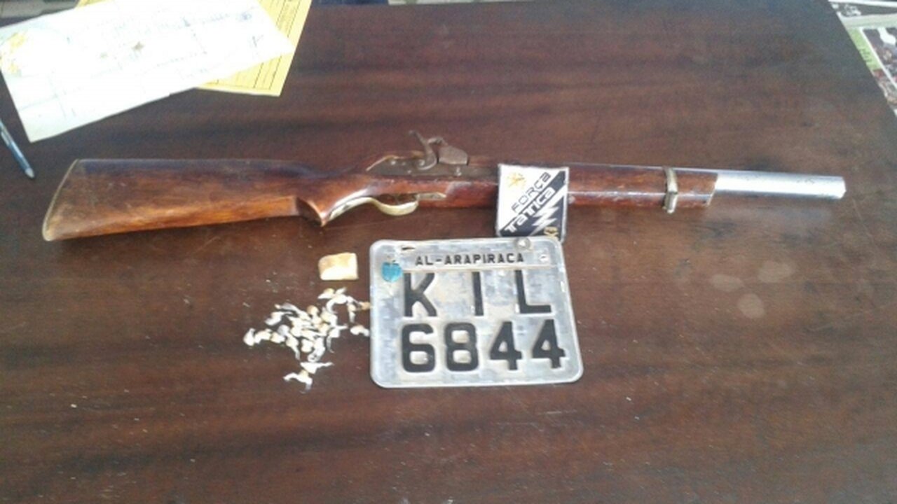 Duas bicicletas e uma espingarda calibre 12 foram encontradas, além de uma placa de moto e drogas. Dois menores e um homem identificado como David Tibúrcio da Silva, 27 anos, foram detidos.