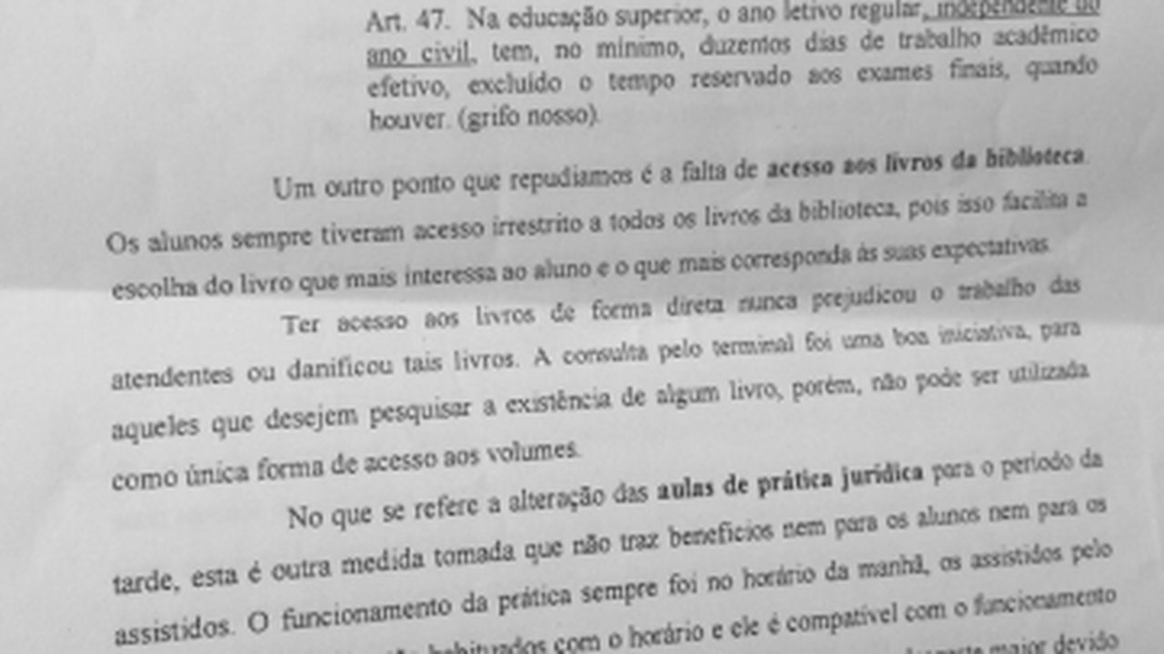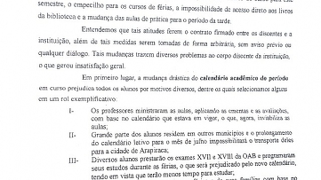 A nota enviada ao portal 7 Segundos pelos representantes de todos os períodos do curso de Direito, ratifica as denúncias feitas sobre a alteração do calendário, o empecilho para o curso de férias, a limitação do acesso à biblioteca e a mudança das aulas práticas para o período da tarde.
