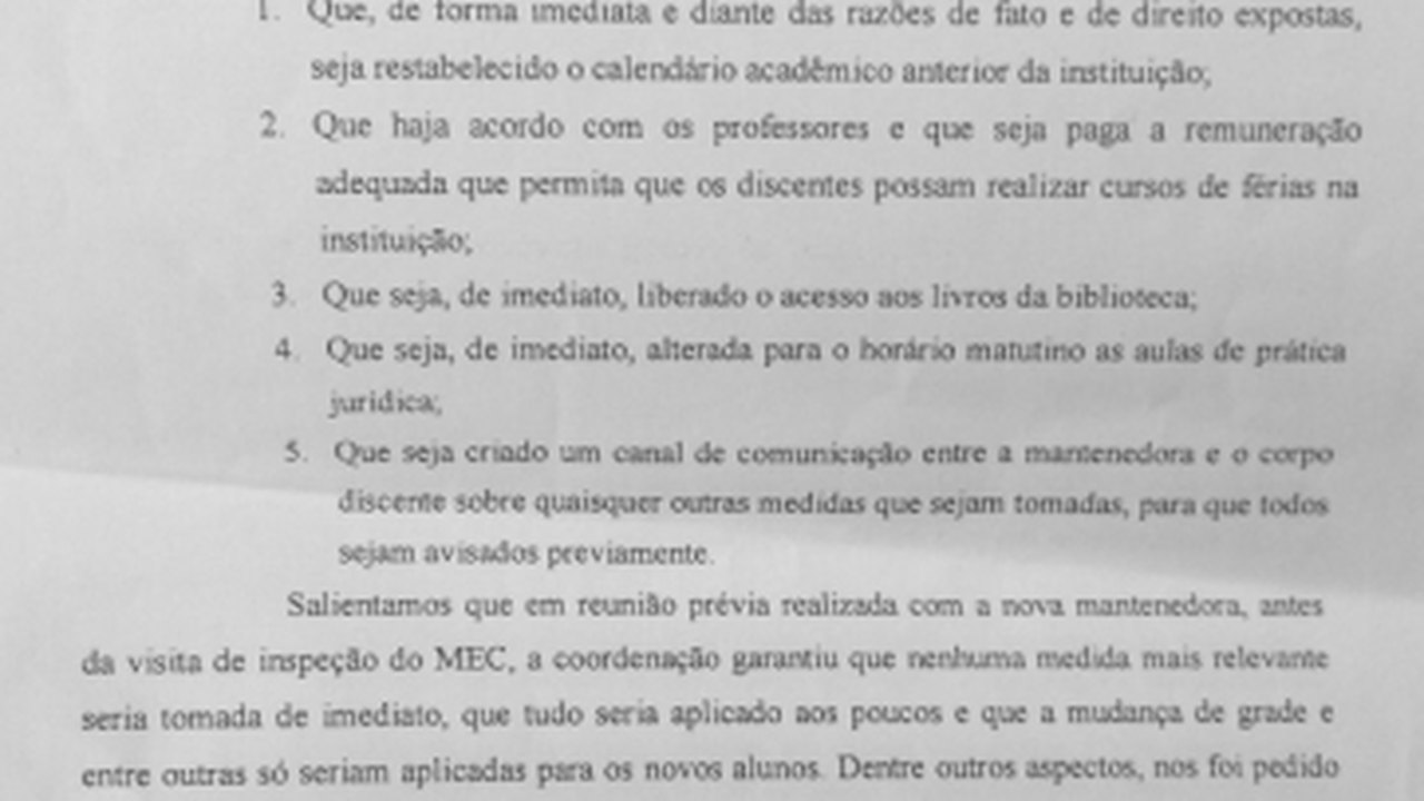 De acordo com a nota, as mudanças foram realizadas sem que os alunos fossem informados ou estabelecido qualquer diálogo entre direção e universitários. Além disso os representantes dos estudantes do curso de direito afirmam que tais medidas ferem o contrato firmado entre os discentes e a instituição.