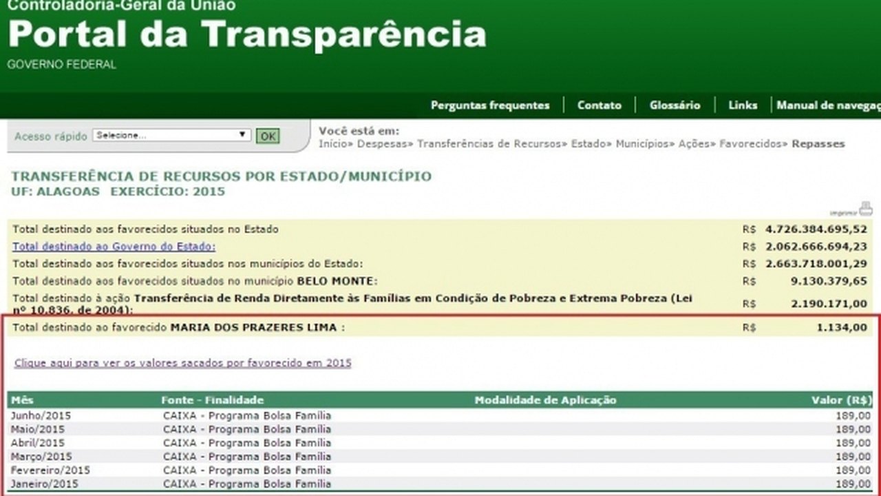 Ao verificar o Portal da Transparência da Controladoria Geral da União, moradores da cidade de Belo Monte, no sertão alagoano, identificaram o nome da esposa do vereador Edielson Soares (PMDB), Maria dos Prazeres Lima, como sendo uma das beneficiárias do Programa Bolsa Família na cidade.