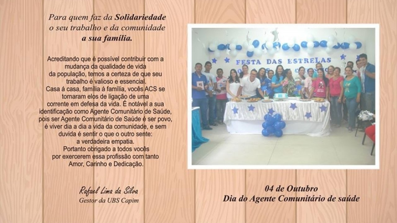 Festa das Estrelas, esse foi o nome dado a festa surpresa feita para os Agentes Comunitários de Saúde(ACS) da Unidade Básica de Saúde (UBS) da comunidade Capim, zona rural de Arapiraca. A homenagem realizada na última quinta-feira (01) foi em comemoração ao Dia Nacional dos Agentes Comunitários de Saúde, cuja data oficial é dia 04 de outubro.