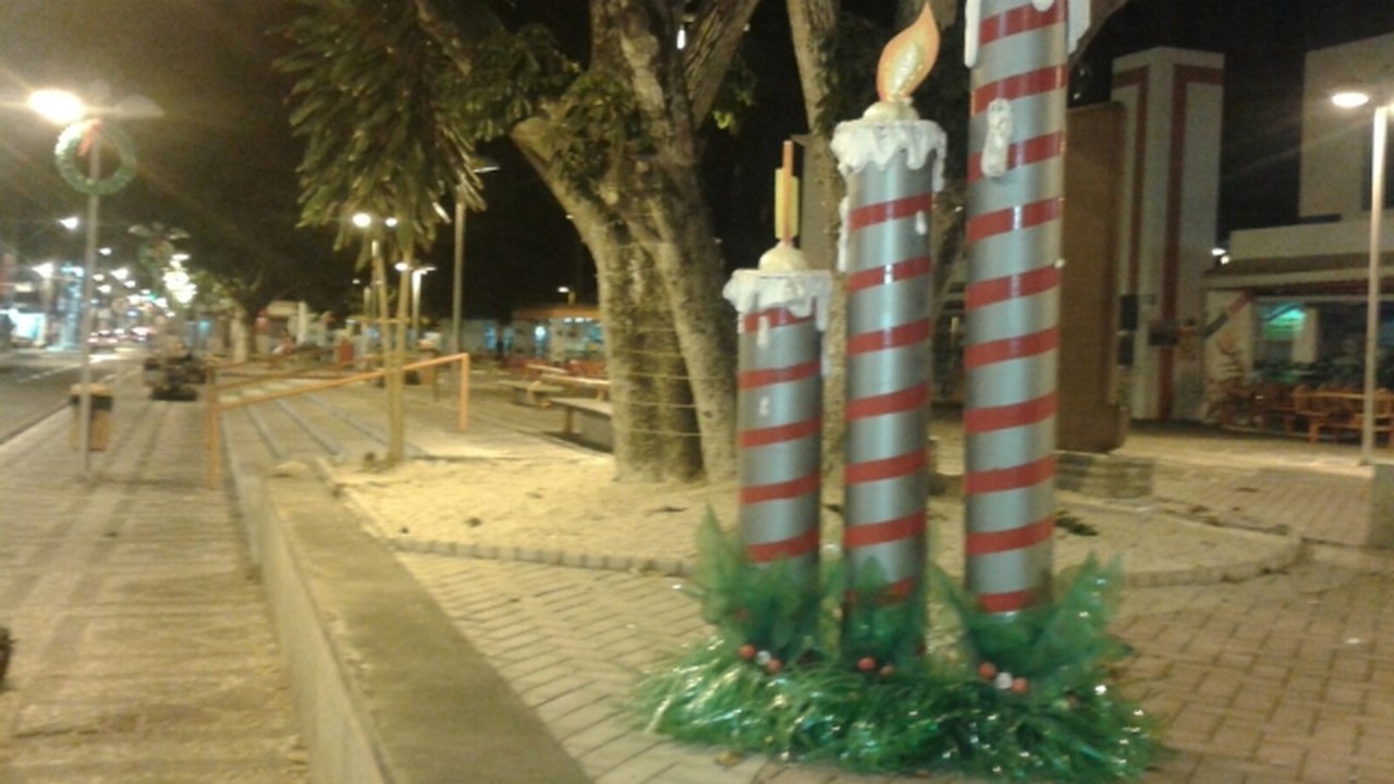 Os caules das árvores ganharam iluminação de luzes especiais e estão 'clareando' as noites de Arapiraca. Velas gigantes também decoram o comércio da cidade.