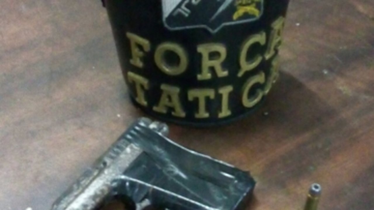 Ao fazer a revista pessoal os policiais encontraram um revólver de brinquedo (simulacro) e uma munição calibre 32. Ao fazer a consulta sobre o veículo utilizado pelos suspeitos foi constatado que a moto Honda Pop foi roubada no último sábado(2).