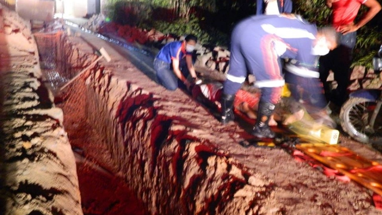 Dois homens ficaram feridos após caírem em uma vala aberta na Rua Nossa Senhora da Salete, bairro Itapuã, em Arapiraca. O acidente ocorreu na madrugada deste domingo(17), quando o condutor e passageiro caíram no buraco que foi aberto para uma obra de drenagem.
