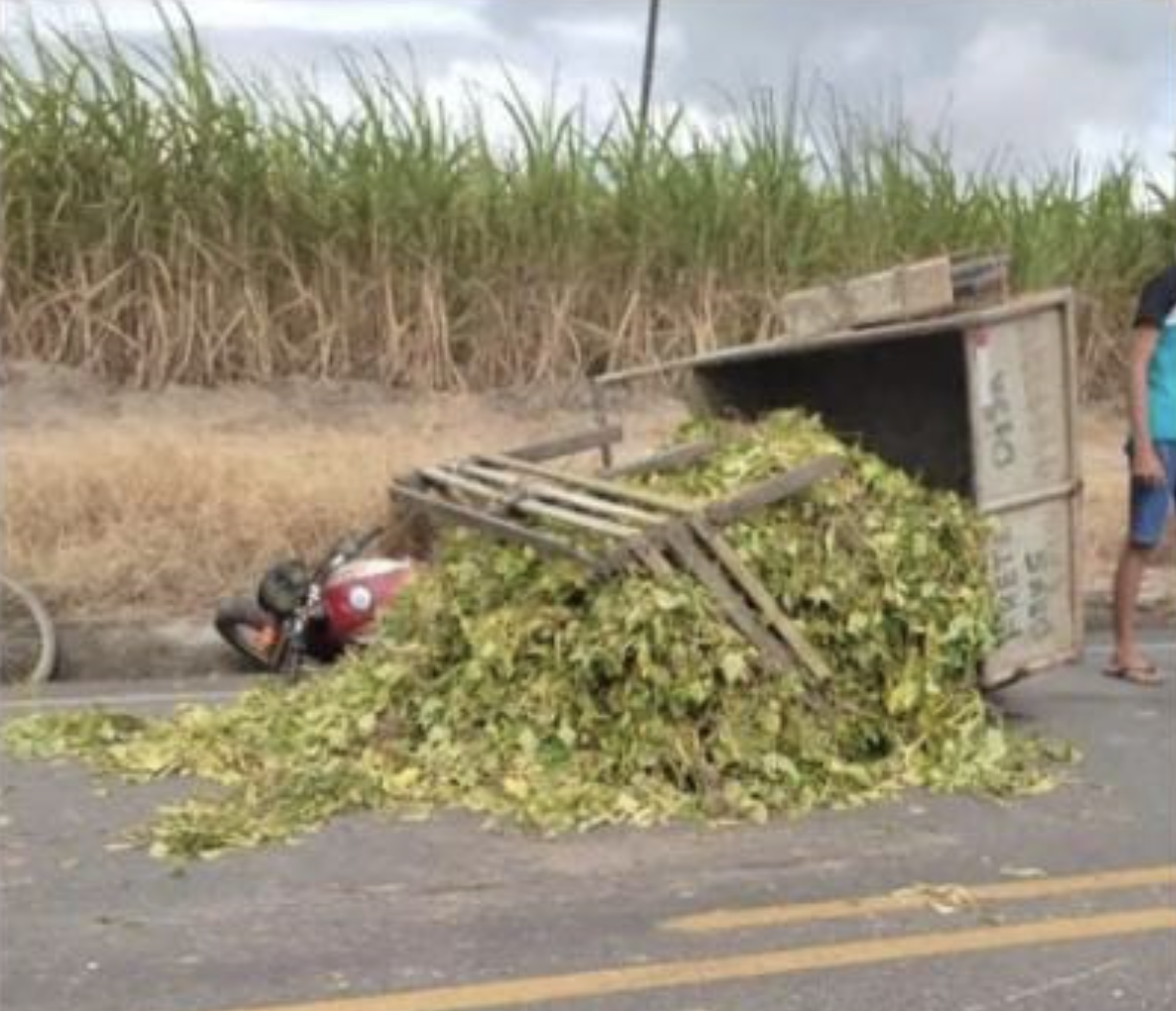 Com o impacto, a carga do reboque caiu sobre o motociclista, que não resistiu aos ferimentos e morreu no local - Foto: Reprodução