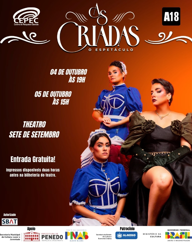 O Cepec é uma instituição alagoana que tem no elenco de As Criadas o trio formado por Aldine de Souza, Ana Cecília Silva e Lara Oliveira. O espetáculo tem patrocínio da Secretaria de Estado da Cultura e Economia Criativa (Secult), e acontecerá no Theatro Sete de Setembro graças ao apoio da PNAB/Ministério da Cultura e da SEMCLEJ/Prefeitura de Penedo.