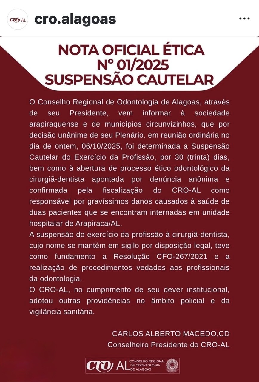 O Conselho Regional de Odontologia de Alagoas informou que, além do processo ético, também foram adotadas medidas junto à Vigilância Sanitária e às autoridades policiais. O caso é investigado pela 4ª Delegacia Regional de Polícia de Arapiraca.