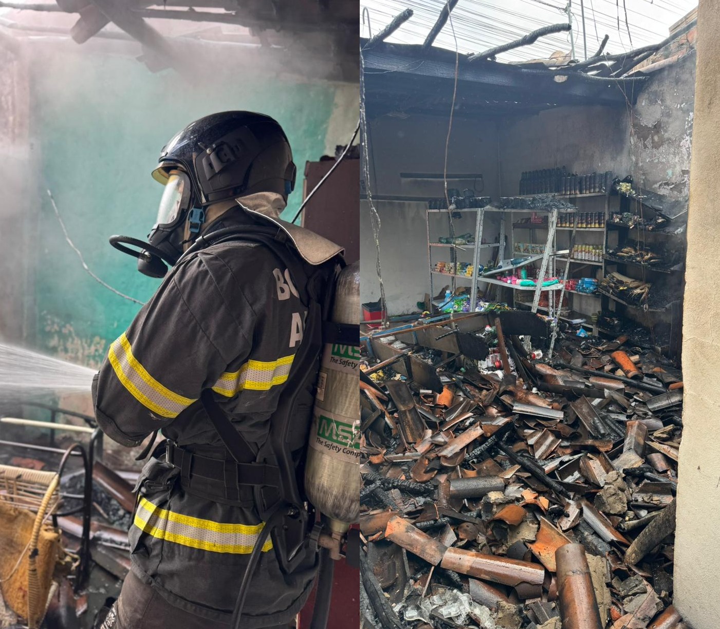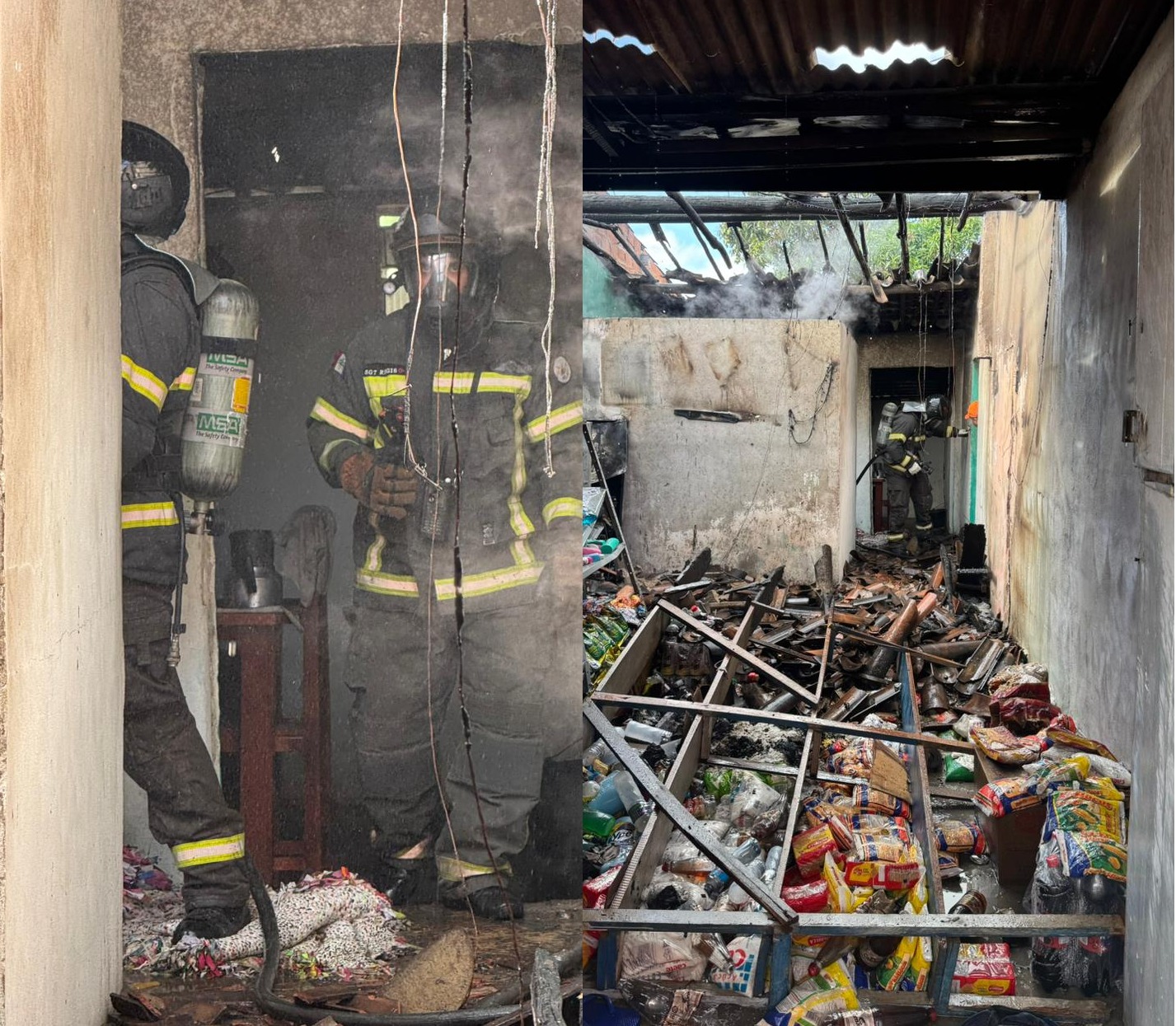 As fotos revelam o telhado destruído, paredes escurecidas pela fumaça e produtos queimados ou cobertos por fuligem no interior do estabelecimento. Apesar do cenário de destruição, não houve registro de feridos.
