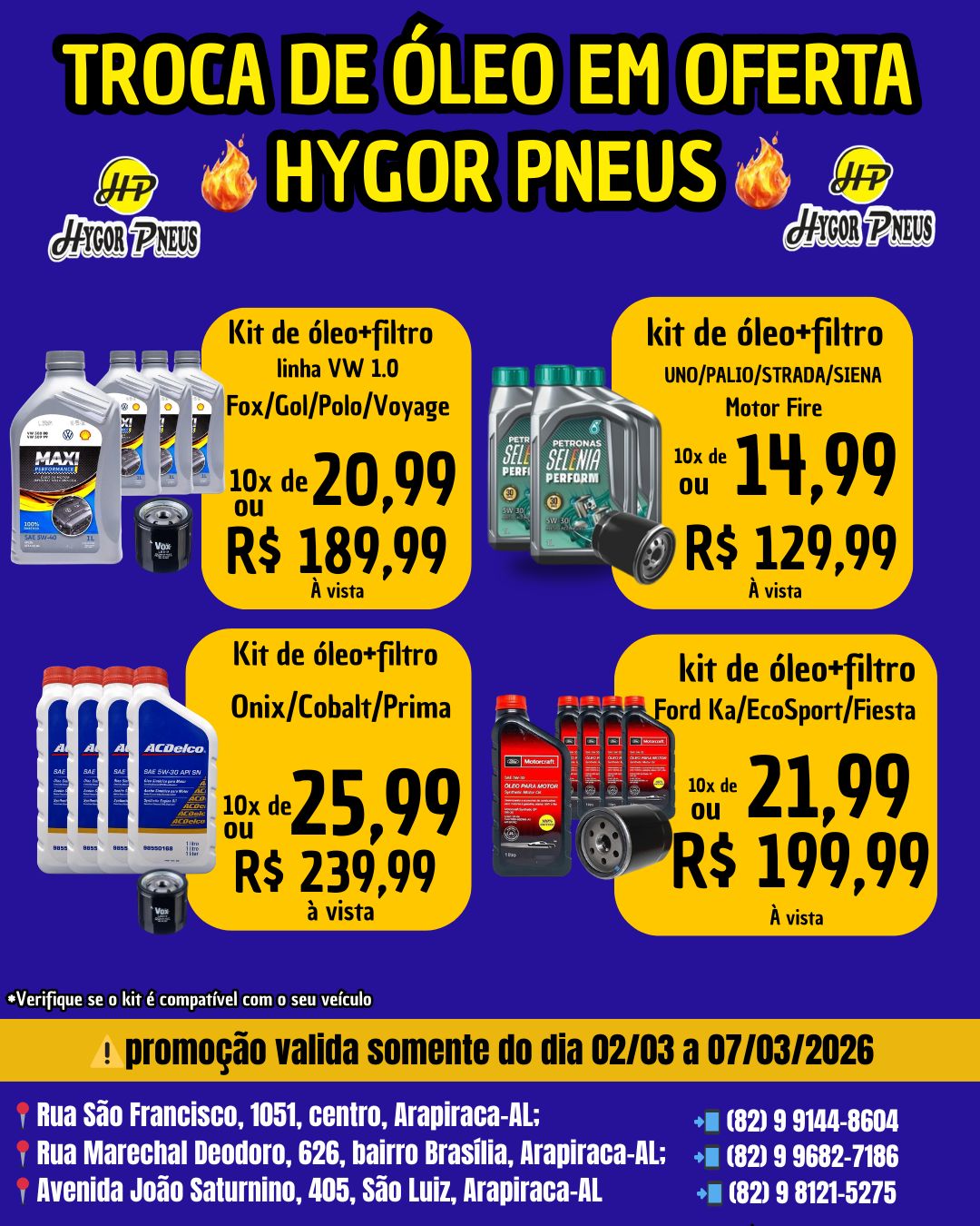 A semana de promoção da troca de óleo da Hygor Pneus já começou em Arapiraca e reúne ofertas para diferentes modelos de veículos. A campanha é válida de 2 a 7 de março de 2026 em todas as unidades da empresa no município.