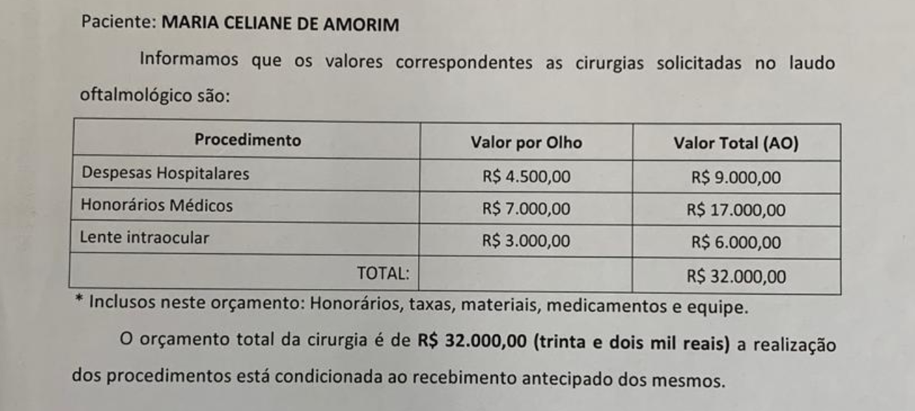 O custo total da cirurgia foi orçado em R$ 32 mil, valor considerado fora da realidade financeira da família. Diante disso, a filha iniciou uma campanha online e vem fazendo um apelo à população para arrecadar o montante necessário.