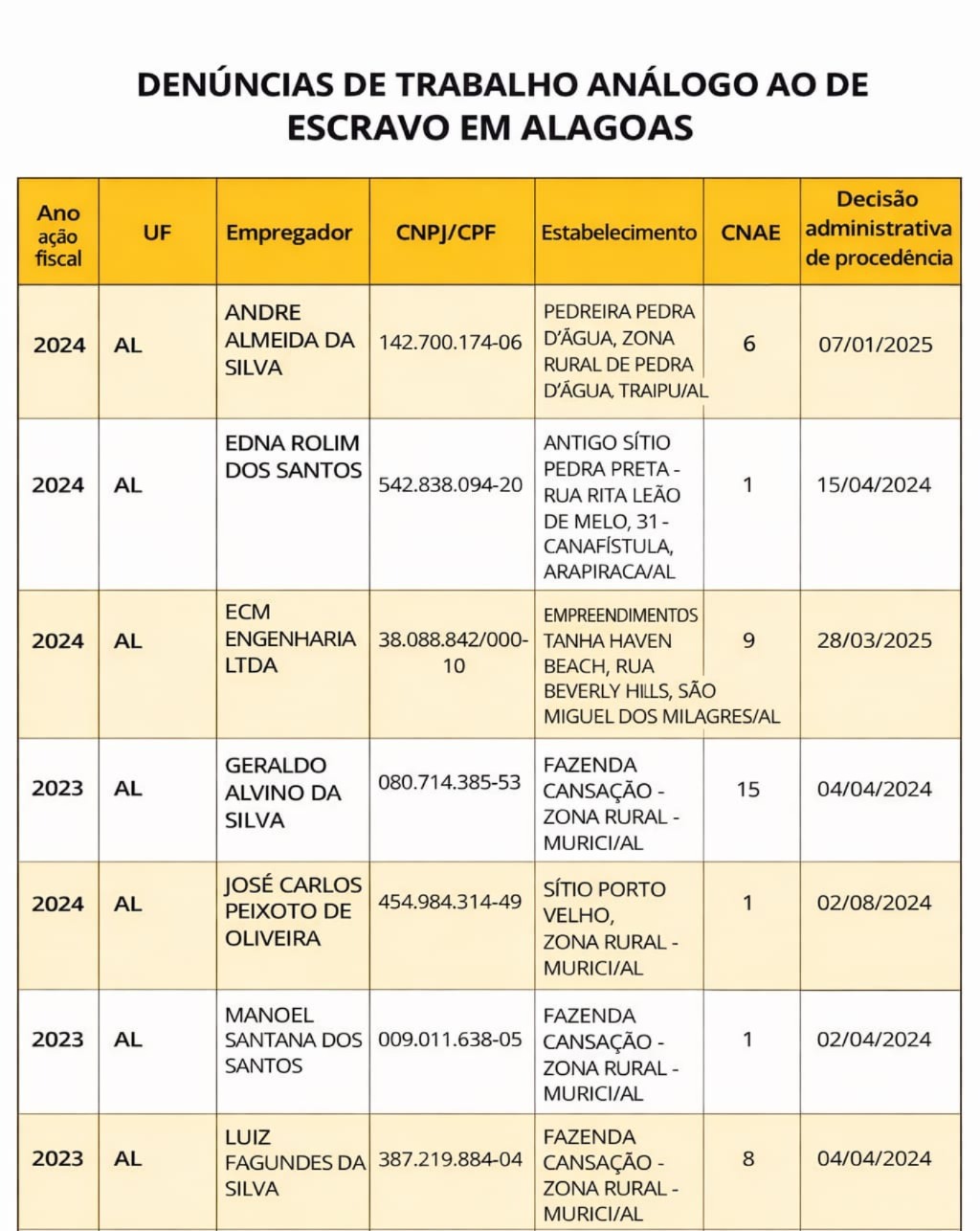 Entre os nomes incluídos na lista em Alagoas estão André Almeida da Silva, associado à Pedra Pedreira, no município de Traipu, e a empresa ECM Engenharia LTDA, com atuação em São Miguel dos Milagres. Os demais casos envolvem propriedades rurais, como a Fazenda Cansanção, em Murici, e o Sítio Porto Velho, também no interior do estado, além do Antigo Sítio Pedra Preta, em Arapiraca.
