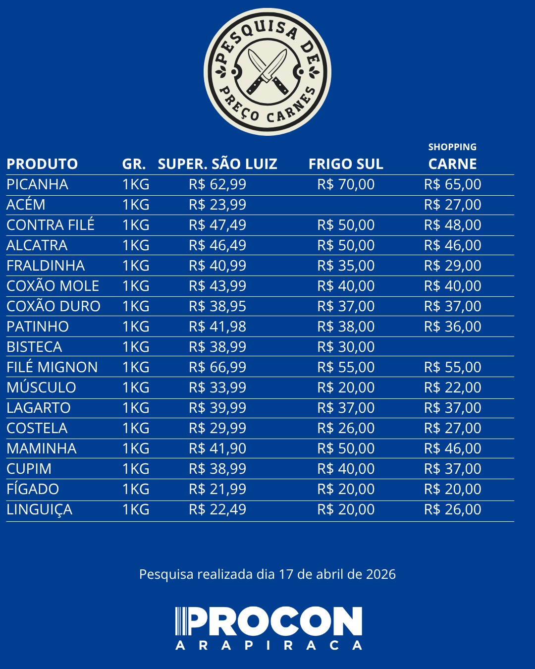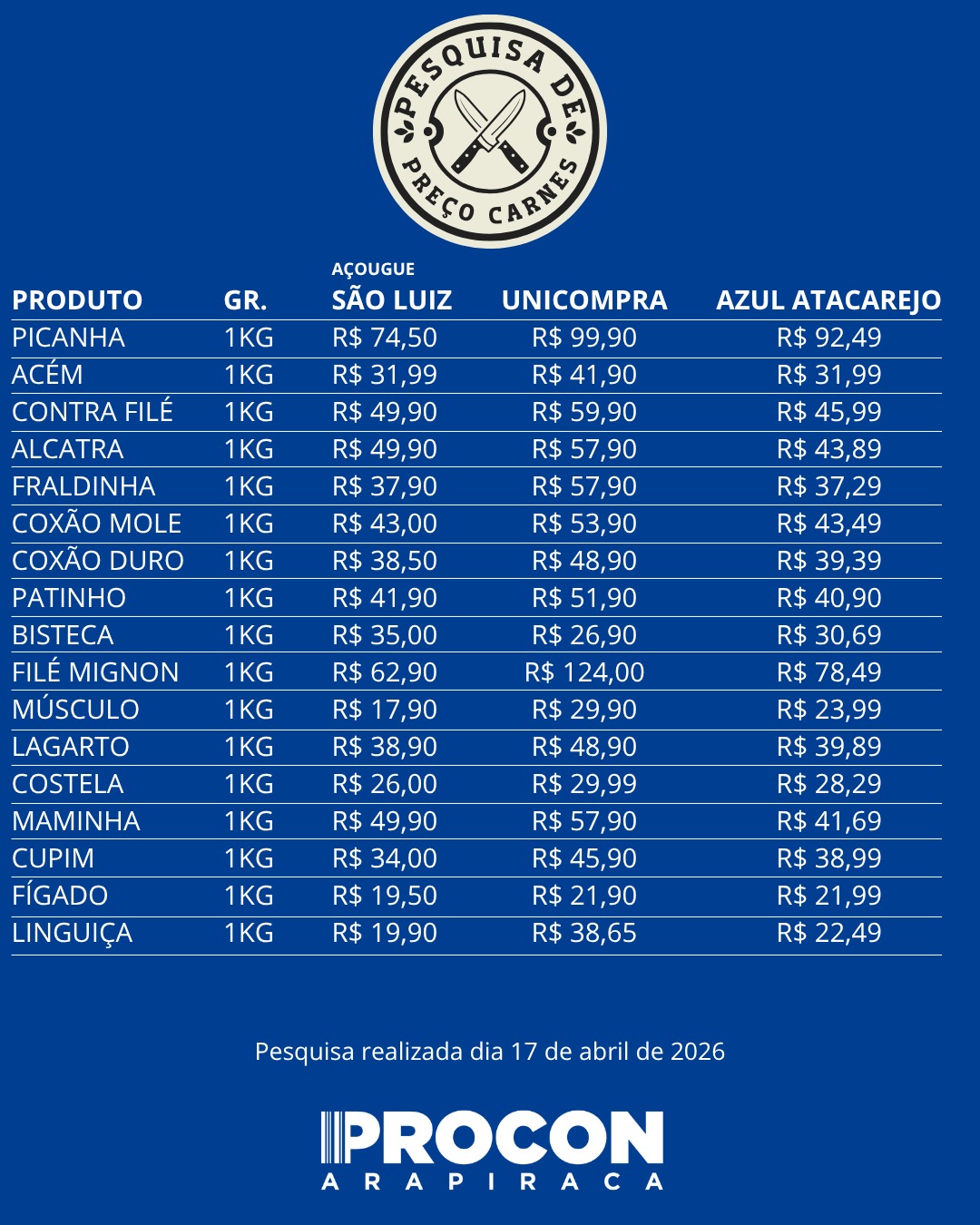 Para auxiliar o consumidor na hora da compra, o Procon Arapiraca divulgou, na quinta-feira (17), uma nova pesquisa de preços de cortes de carnes em estabelecimentos de Arapiraca. O levantamento foi realizado em sete estabelecimentos da cidade com o objetivo de orientar os consumidores na hora da compra e reforçar a importância da pesquisa de preços.