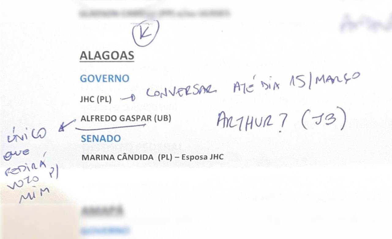 Na parte relativa a Alagoas, Flávio cita dois possíveis nomes ao governo: o prefeito de Maceió, JHC, e o deputado federal Alfredo Gaspar. Ao lado do documento, escrito à caneta, Flávio diz que vai conversar com o prefeito até o dia 15 de março.
