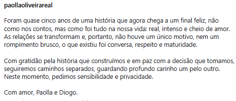 “Foram quase cinco anos de uma história que agora chega a um final feliz, não como nos contos, mas como foi tudo na nossa vida: real, intenso e cheio de amor. As relações se transformam e, portanto, não houve um único motivo, nem um rompimento brusco, o que existiu foi conversa, respeito e maturidade”, afirmaram em trecho do anúncio.