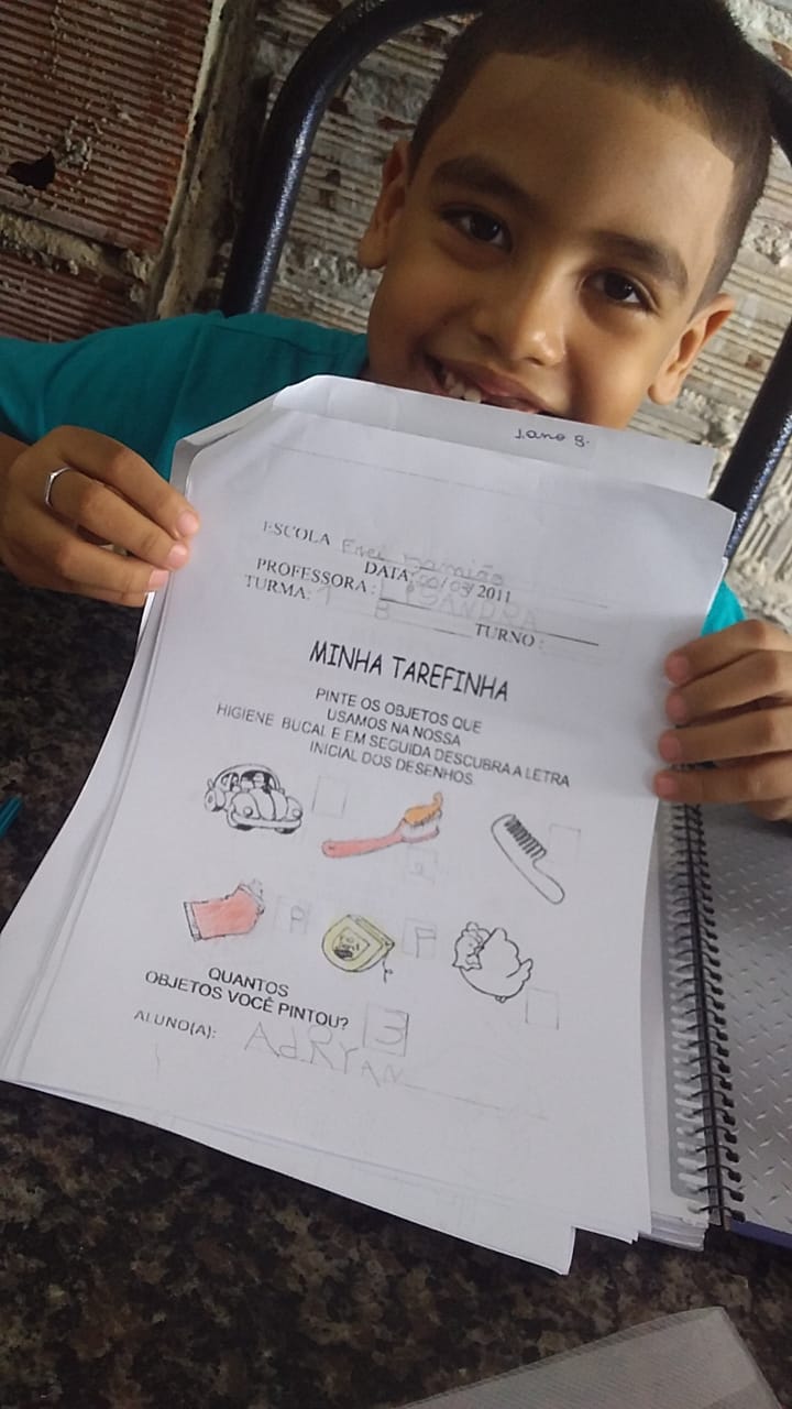 Adryan exibindo a atividade feita em casa. Foto: Ascom Semed