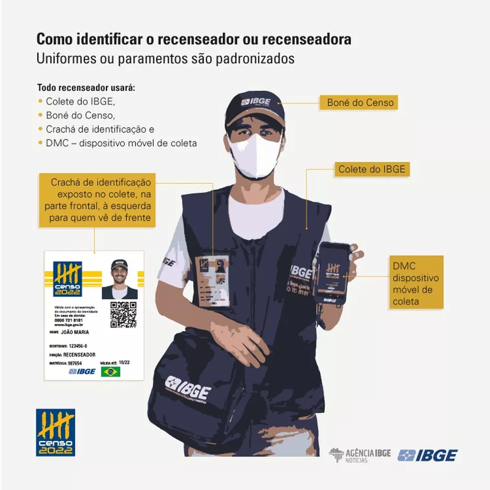 Os entrevistadores do IBGE sempre estão identificados por crachá com nome e matrícula. A identidade dos profissionais pode ser verificada por meio da Central de Atendimento do IBGE, no telefone 0800.721.8181, ou de um formulário no site do instituto.