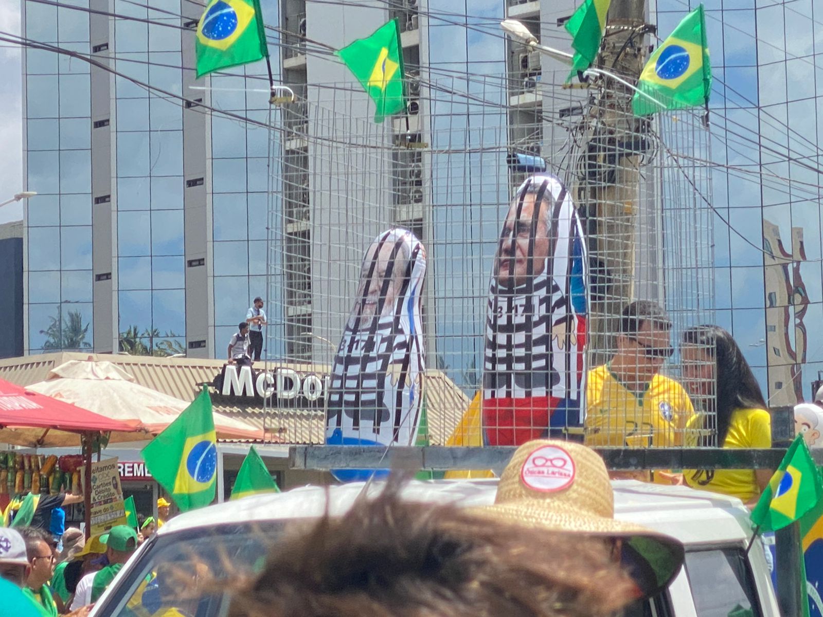 Grande maioria, apoiadora do presidente Jair Bolsonaro, segurava faixas e cartazes com frases contra ministros do STF e dois bonecos gigantes do ex-presidente Lula e do Senador Renan Calheiros, vestidos de presidiários.