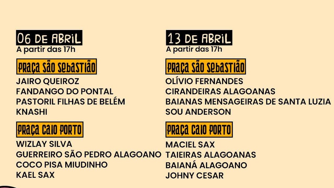 O festival terá início na próxima quinta-feira (06), a partir das 17h, no Pontal da Barra, nas praças São Sebastião e Caio Porto. No Jaraguá, o evento contará com quatro palcos descentralizados na região, ao longo da Rua Sá e Albuquerque.